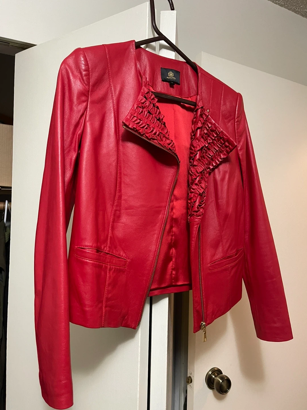 20Selling a vibrant red leather jacket by BESSONA. It's in great condition and ready for a new home! The jacket features a unique ruffled design around the zipper area, adding a touch of flair to the classic leather jacket style