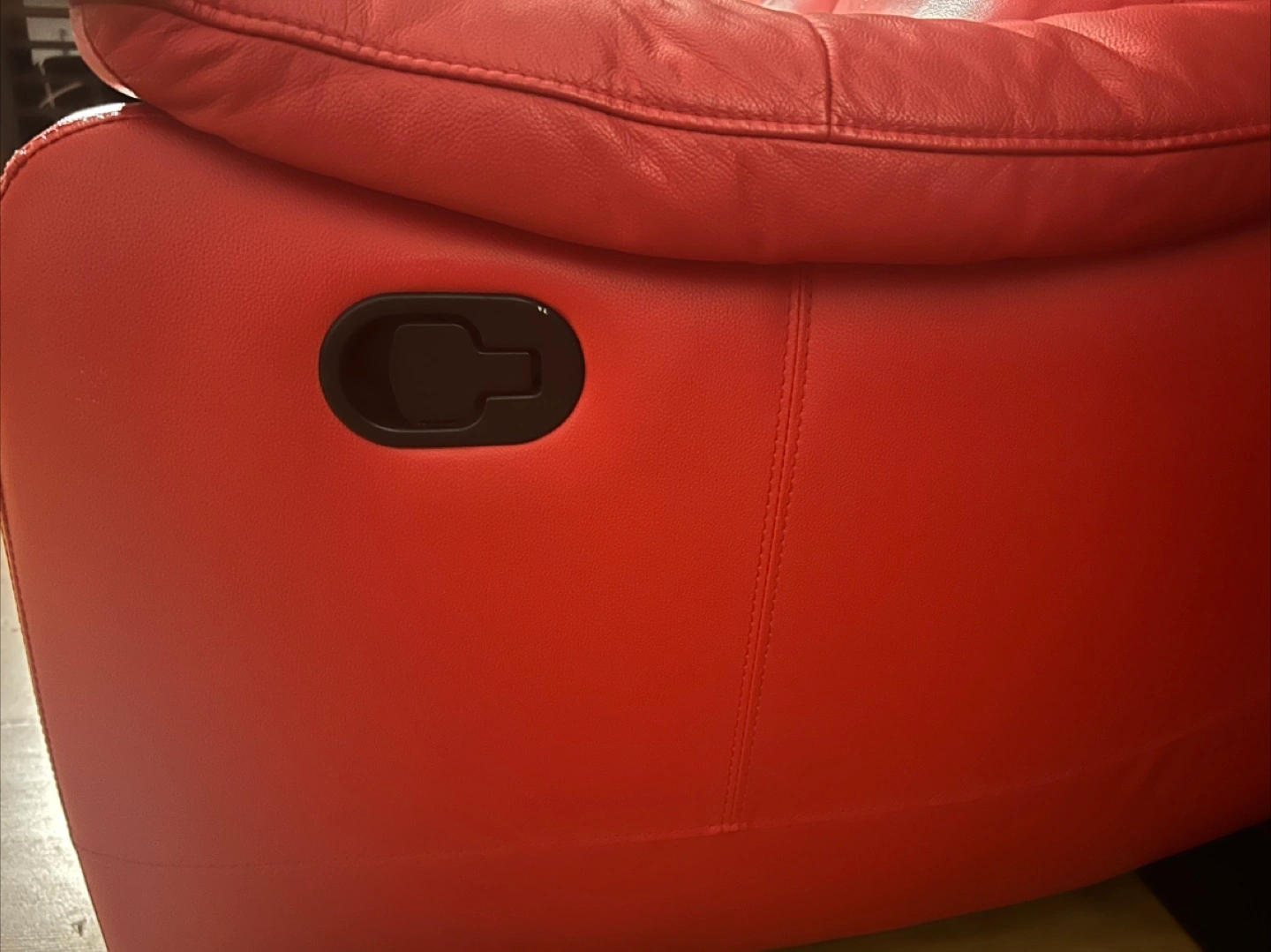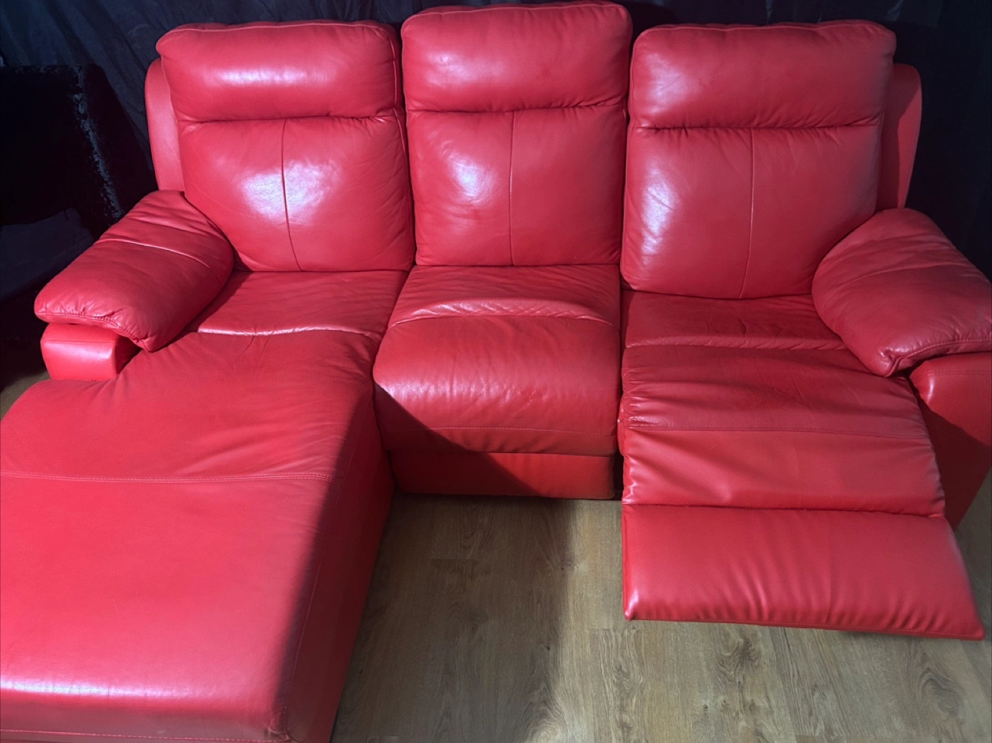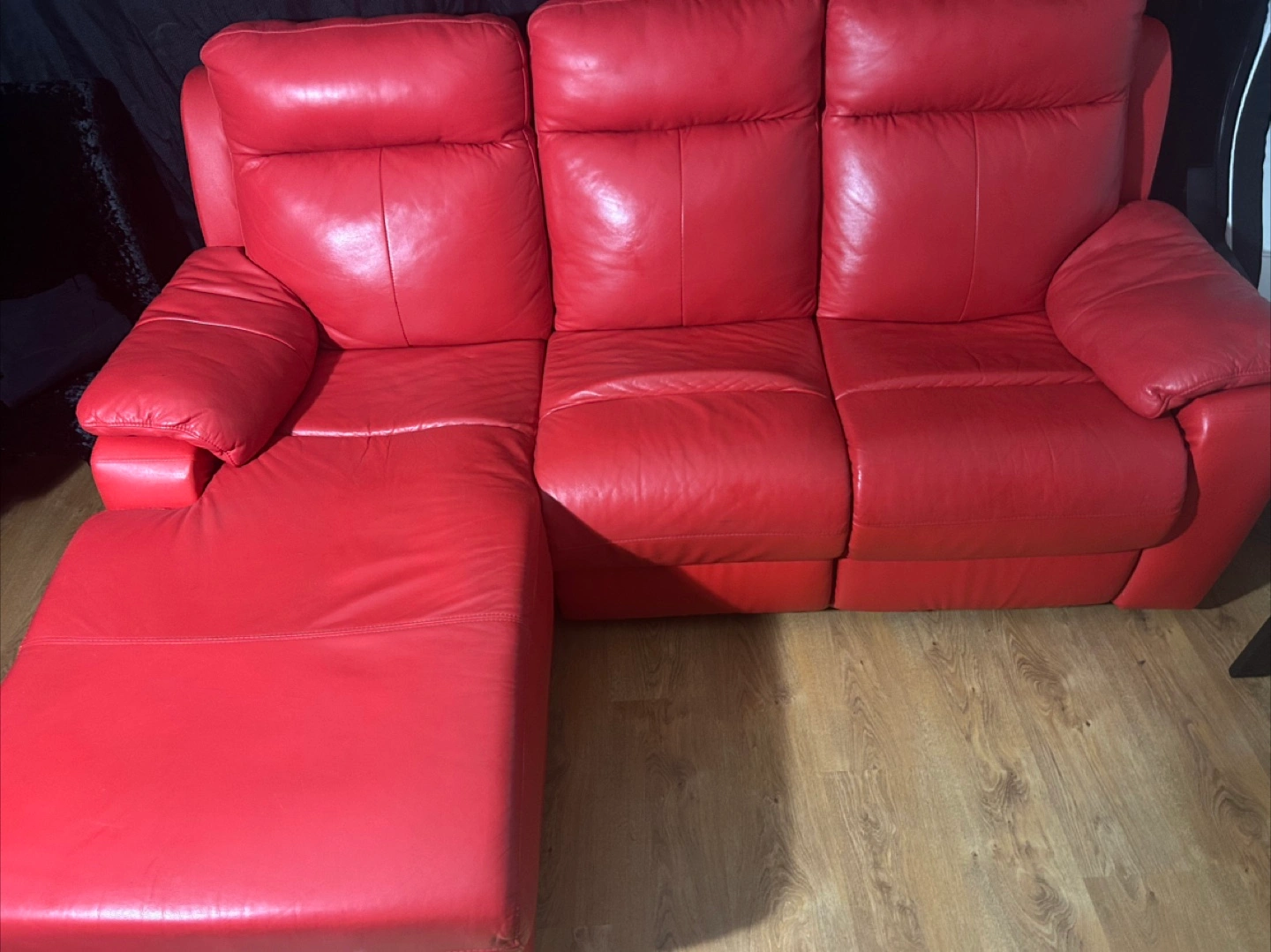 Selling a vibrant red leather reclining sofa with a matching ottoman! It's a great addition to any living room, offering both style and comfort. The reclining feature adds an extra level of relaxation, perfect for kicking back after a long day. The leather is in good condition, with a few signs of wear that add character. This sofa is ready for a new home!