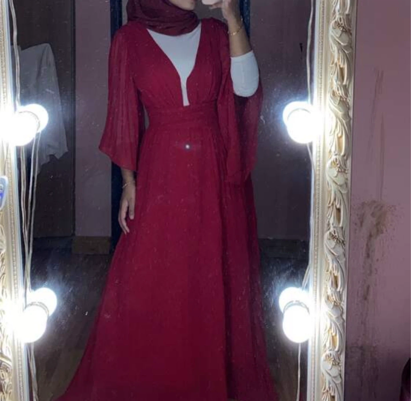 Beautiful red maxi dress with a flattering silhouette and flowing sleeves! It's perfect for a special occasion or just feeling a little fancy. The dress has a deep V-neck and a pleated skirt that moves beautifully. It's in great condition and ready for a new home and it’s also perfect if you are a Muslim that wants a cute stylish dress to go outside with and you are a hijab.