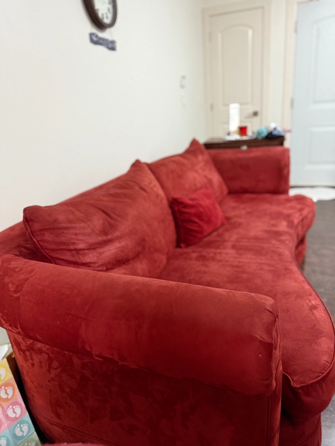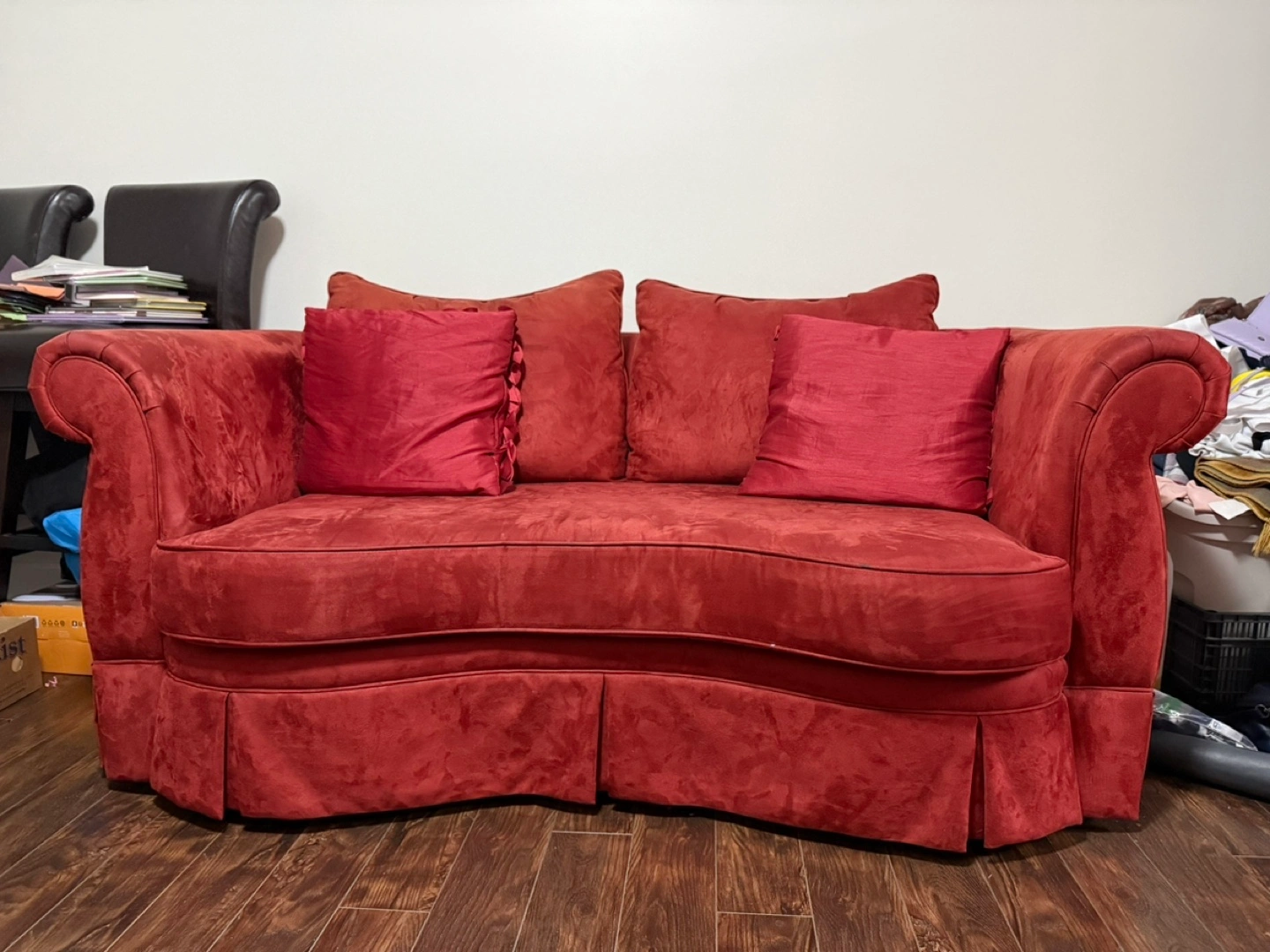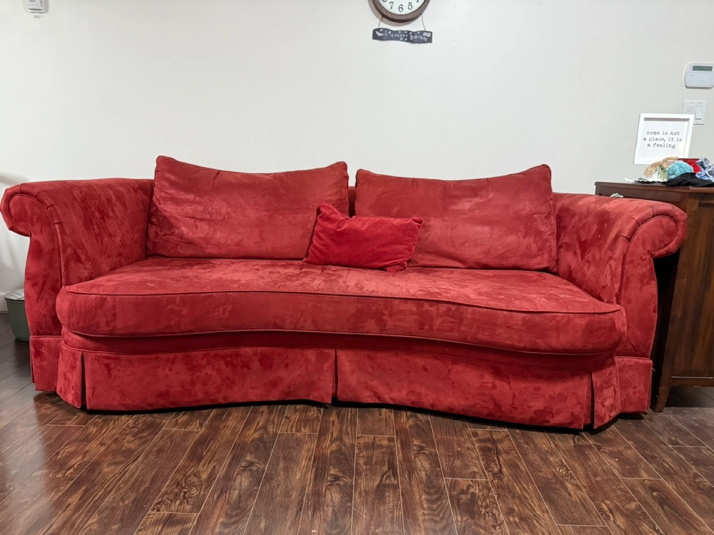 10Curved sofa, red microfiber upholstery. Includes three matching pillows. Rolled arms and skirt. Love seat 70”x42” love seat has sun bleach, shown in pic Full size couch 90”x46”