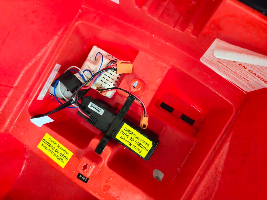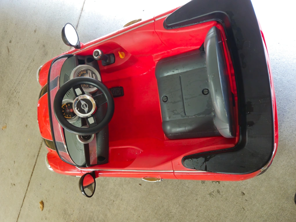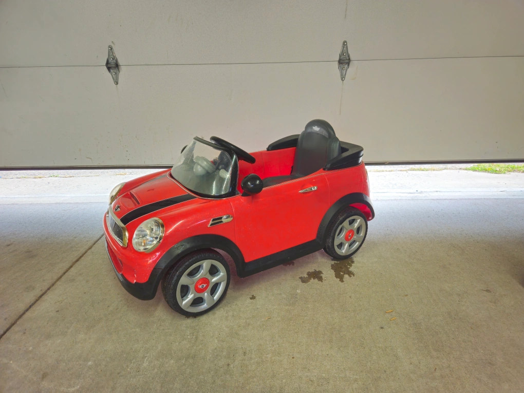 Selling a cute red Mini Cooper ride-on car! It comes with a remote control with parental safety override, perfect for little ones. Includes a battery charger as well