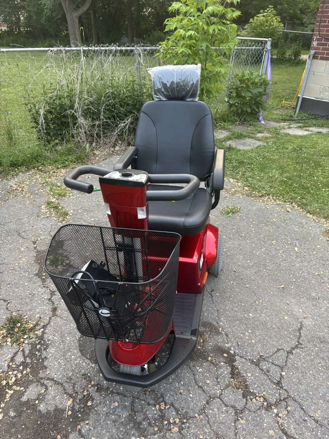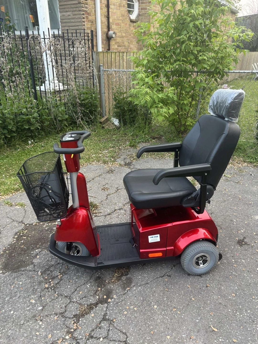 10I am offering a red mobility scooter. Features include a seat with armrests and a headrest, a basket in the front, and a footplate. It is a great way to enjoy leisurely strolls in the park.