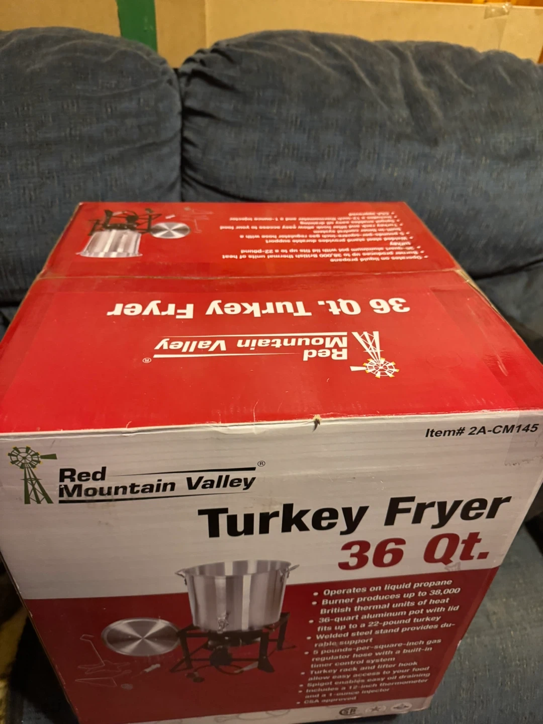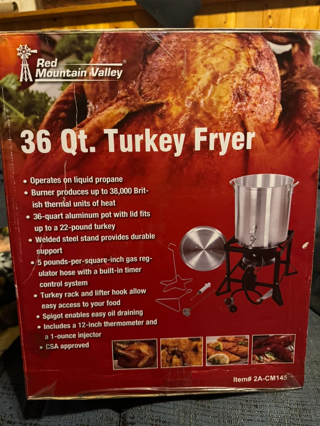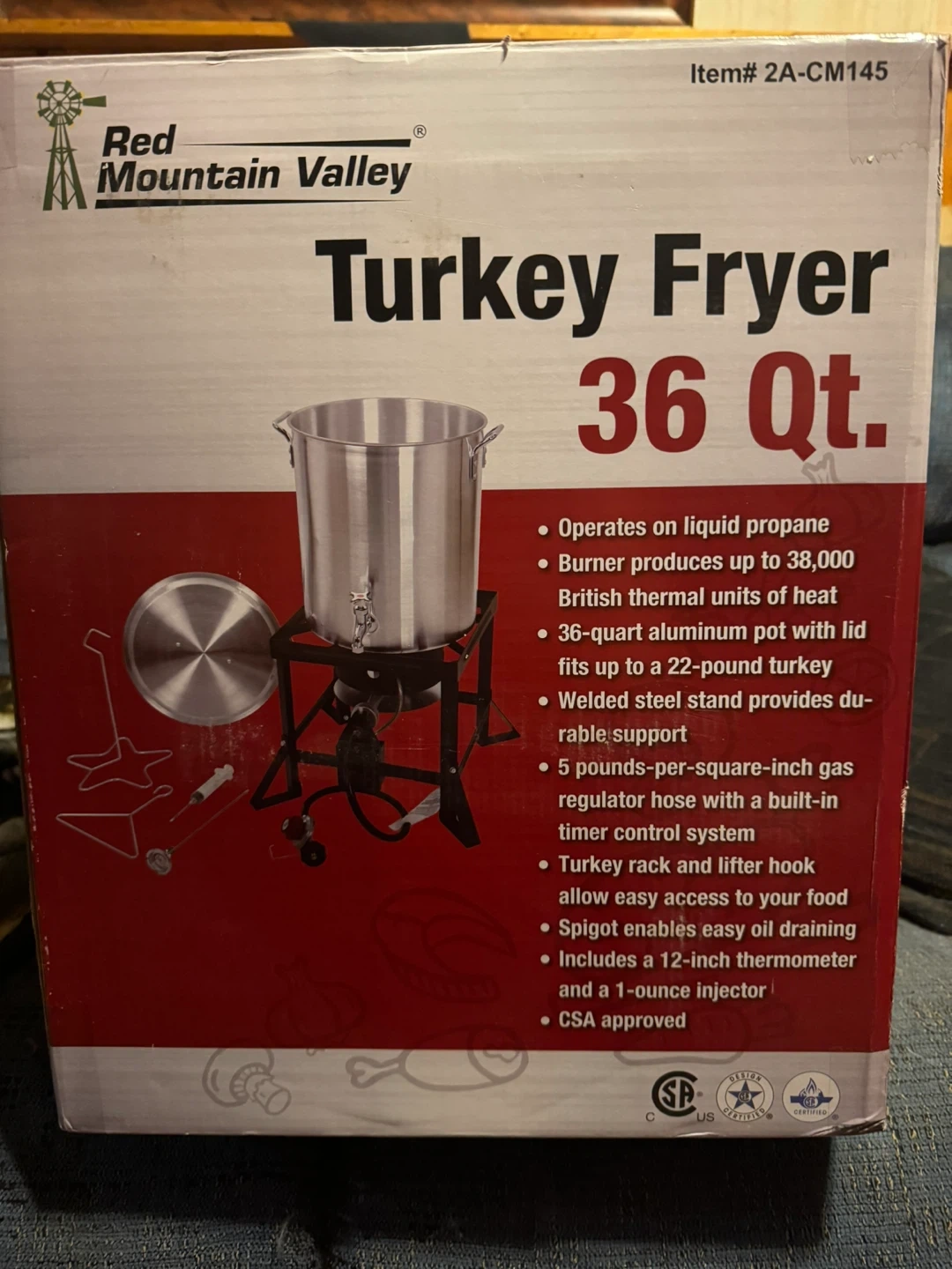 10Selling a Red Mountain Valley 36 Qt. Turkey Fryer! It operates on liquid propane and the burner produces up to 38,000 British thermal units of heat. It features a 36-quart aluminum pot with lid that fits up to a 22-pound turkey and has a welded steel stand that provides durable support. The turkey rack and lifter hook allow easy access to your food, and the spigot enables easy oil draining. Included is a 12-inch thermometer and a 1-ounce injector. It's also CSA approved! BRAND NEW UNOPENED BOX