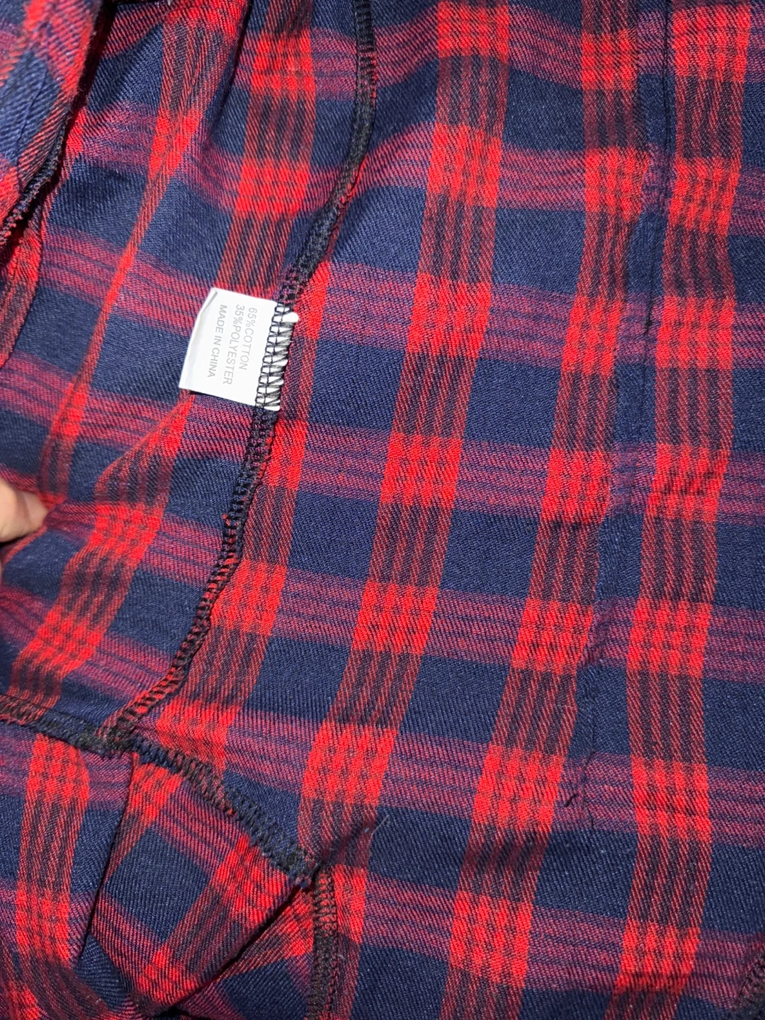66Here's a cozy flannel shirt in a classic red and navy plaid pattern! The material is 60% cotton and 40% polyester, making it soft and comfortable. Perfect for layering during the cooler months!