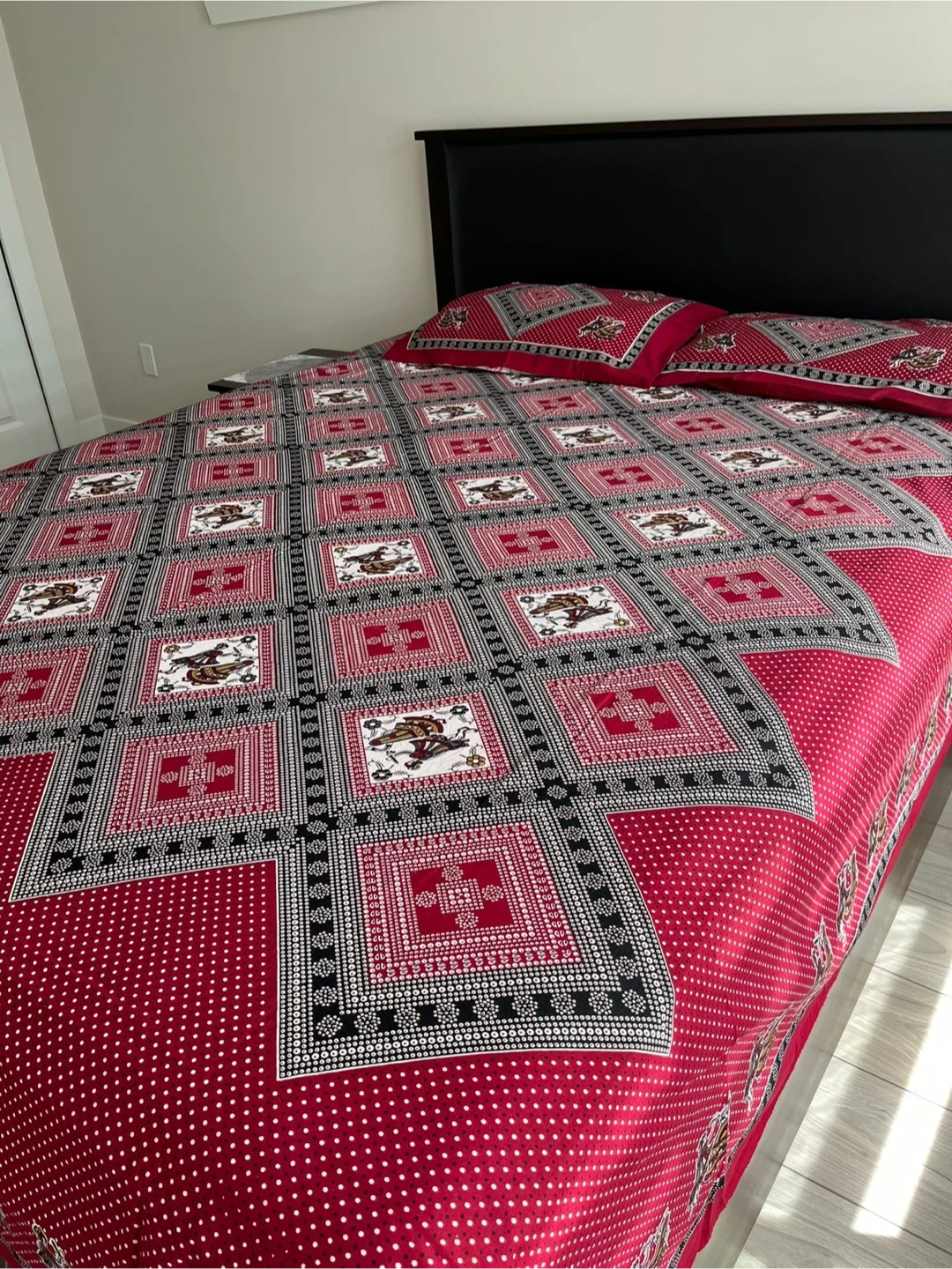 Selling a red patterned bedding set! It's brand new with two pillow covers and would look lovely in any bedroom Queen size