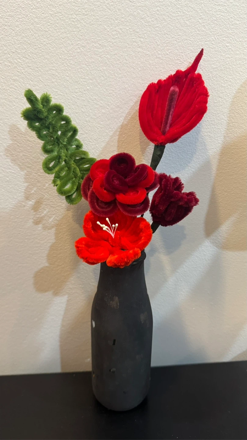 117A cute arrangement of red pipe cleaner flowers in a dark vase. Perfect for adding a pop of colour to any room!