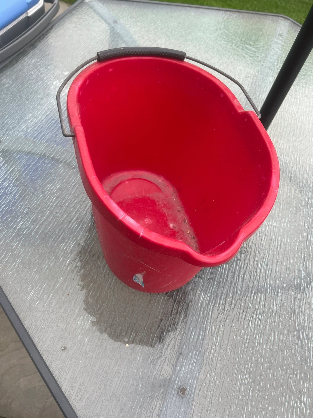Selling a red plastic bucket! It's a handy item for various tasks around the house or garden. It shows some signs of use, but it's still perfectly functional for carrying water, tools, or other items. Please take a look at the pictures to see the condition