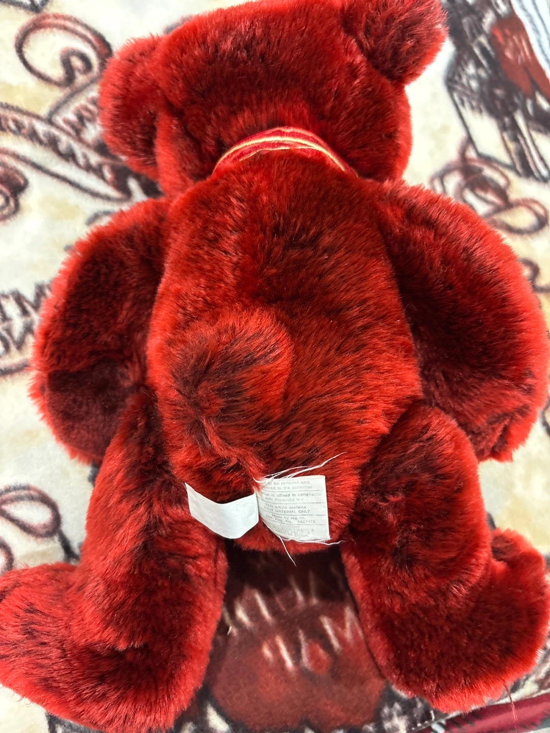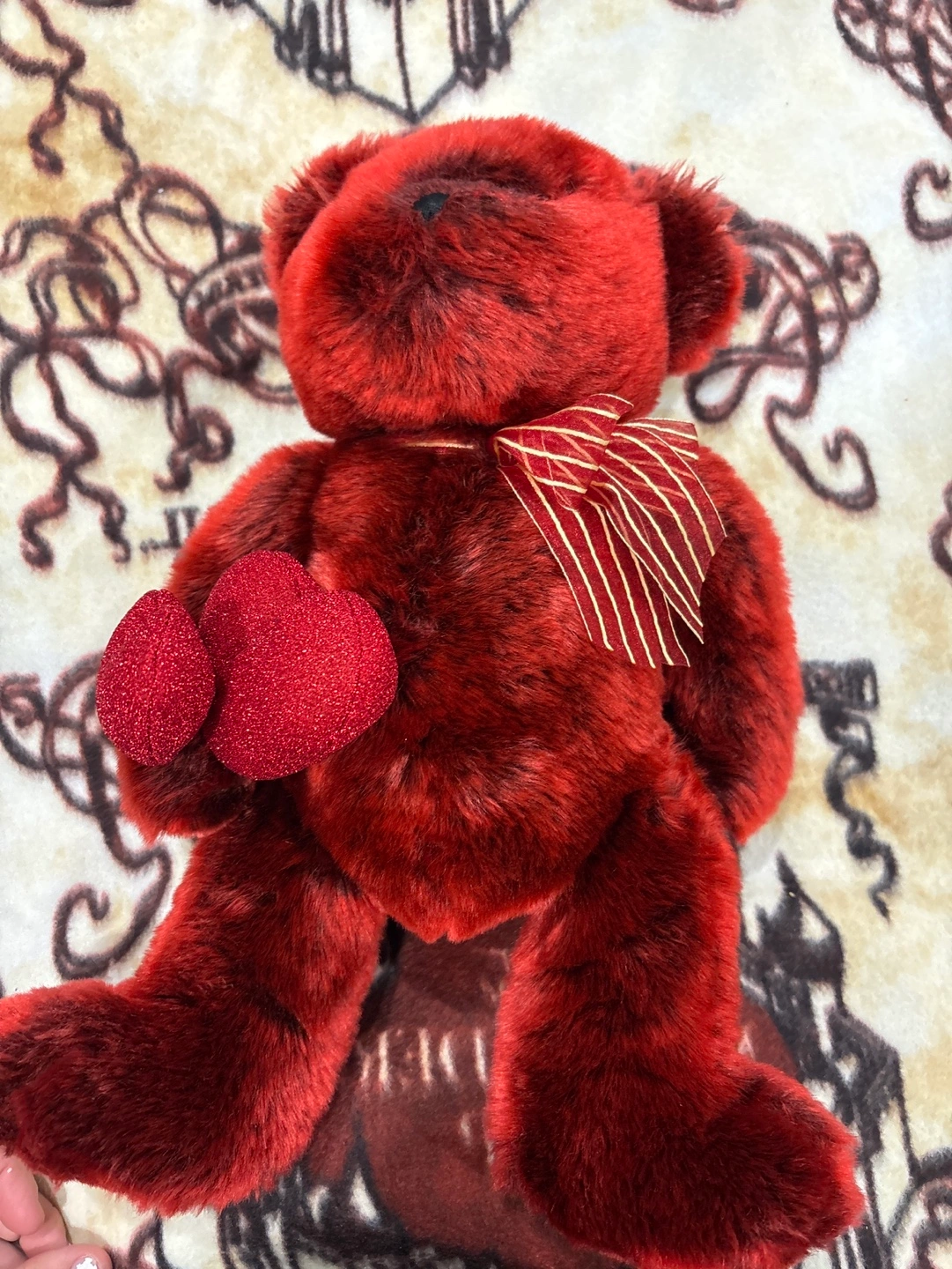 Red plush teddy bear with red hearts. Has a red and gold bow around its neck.