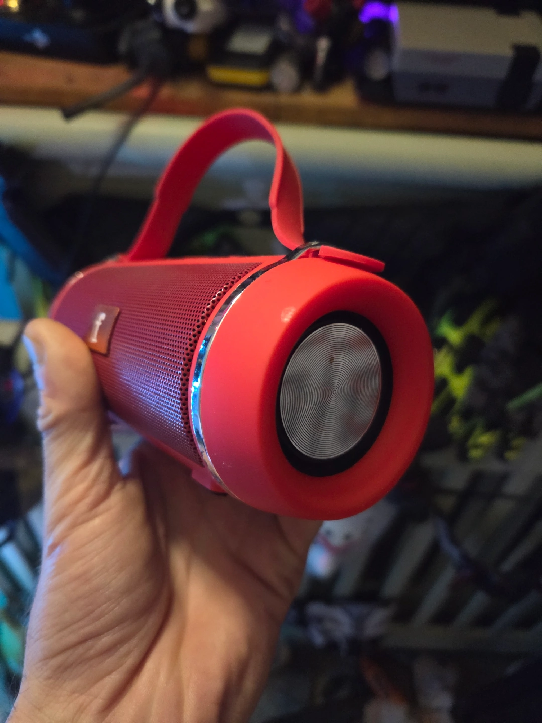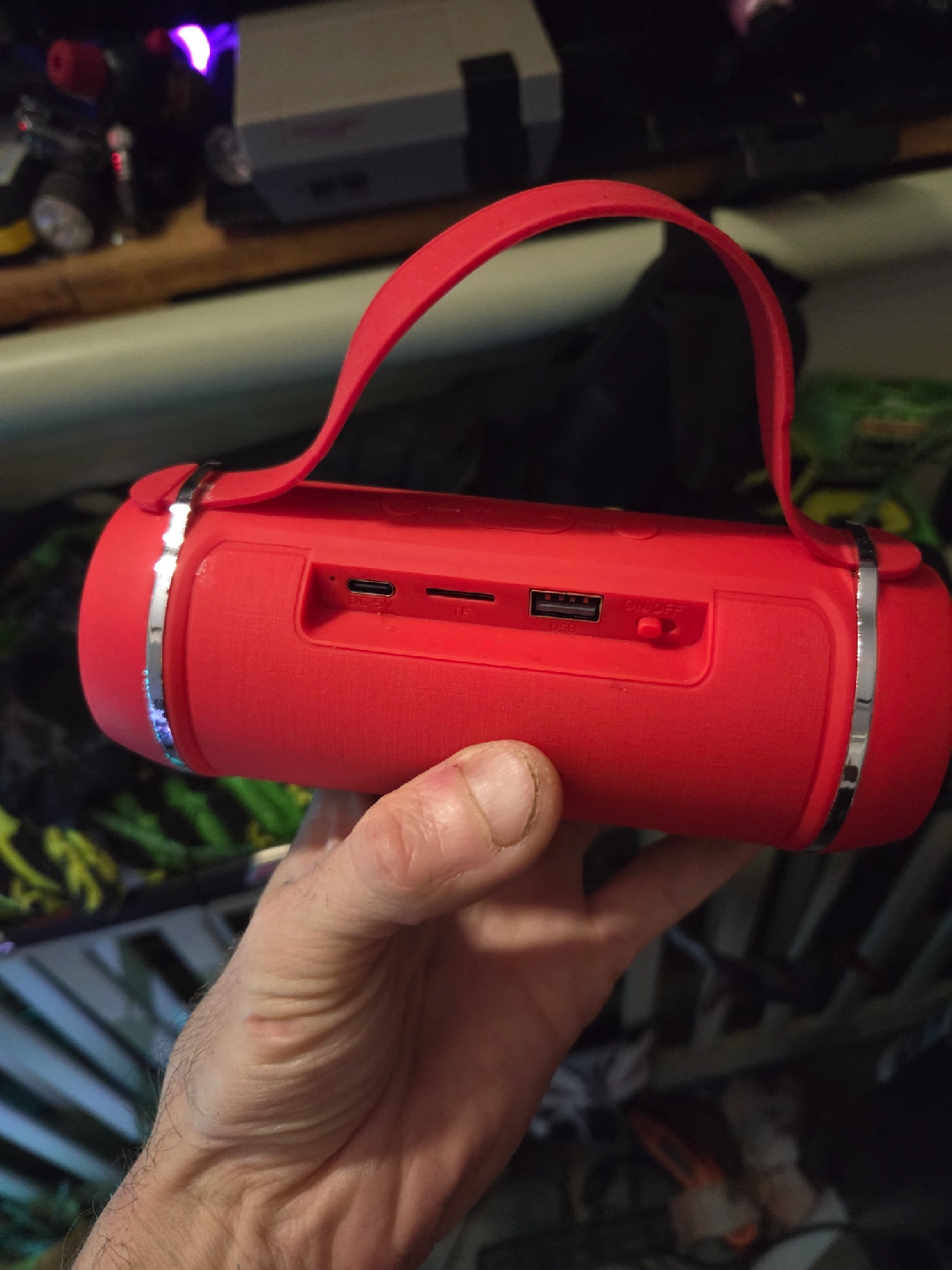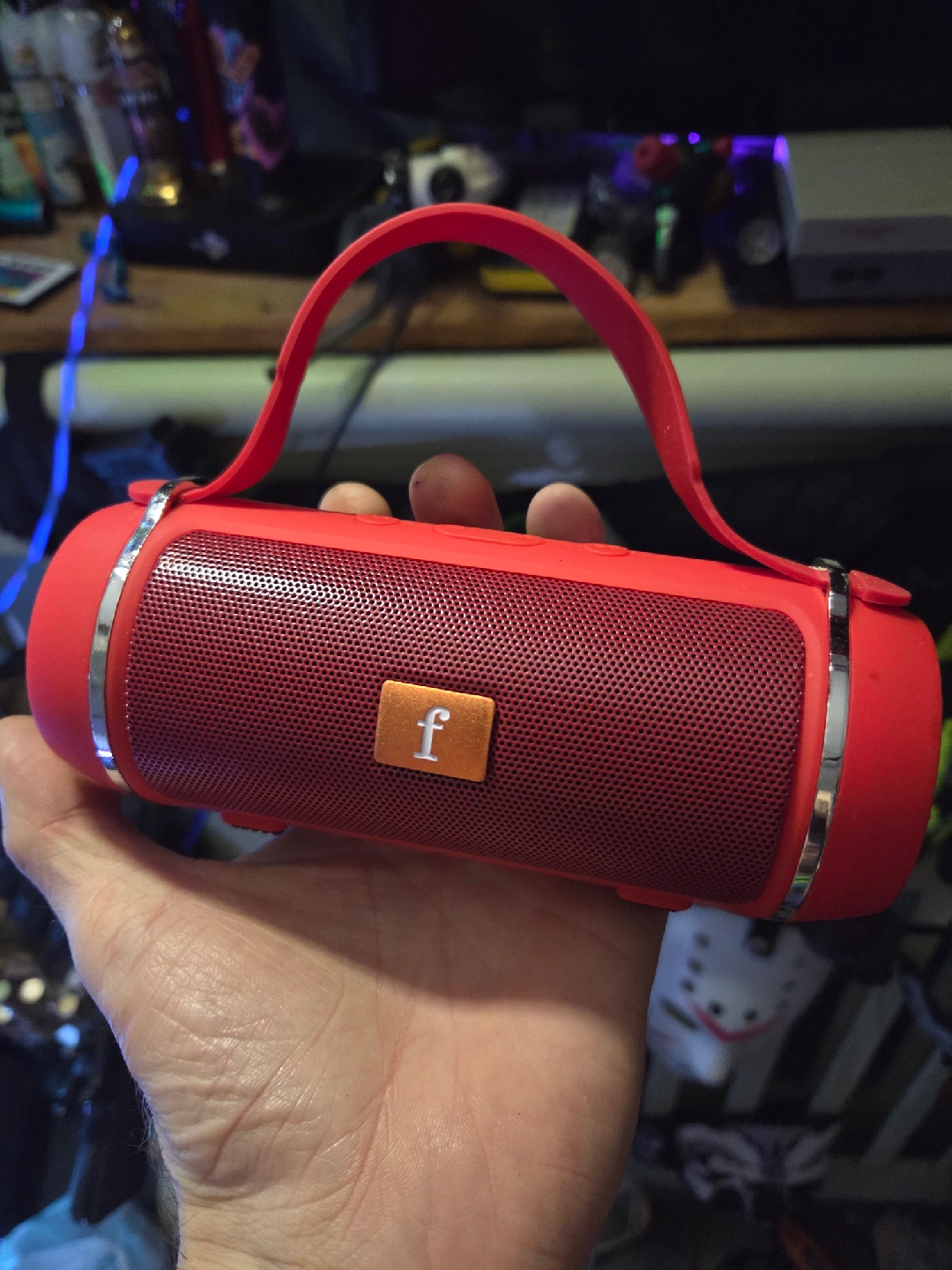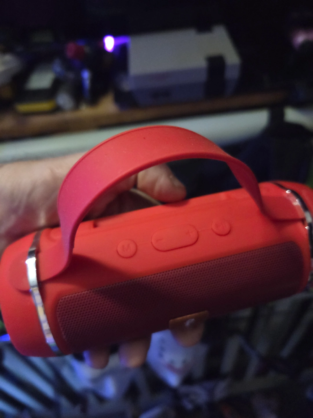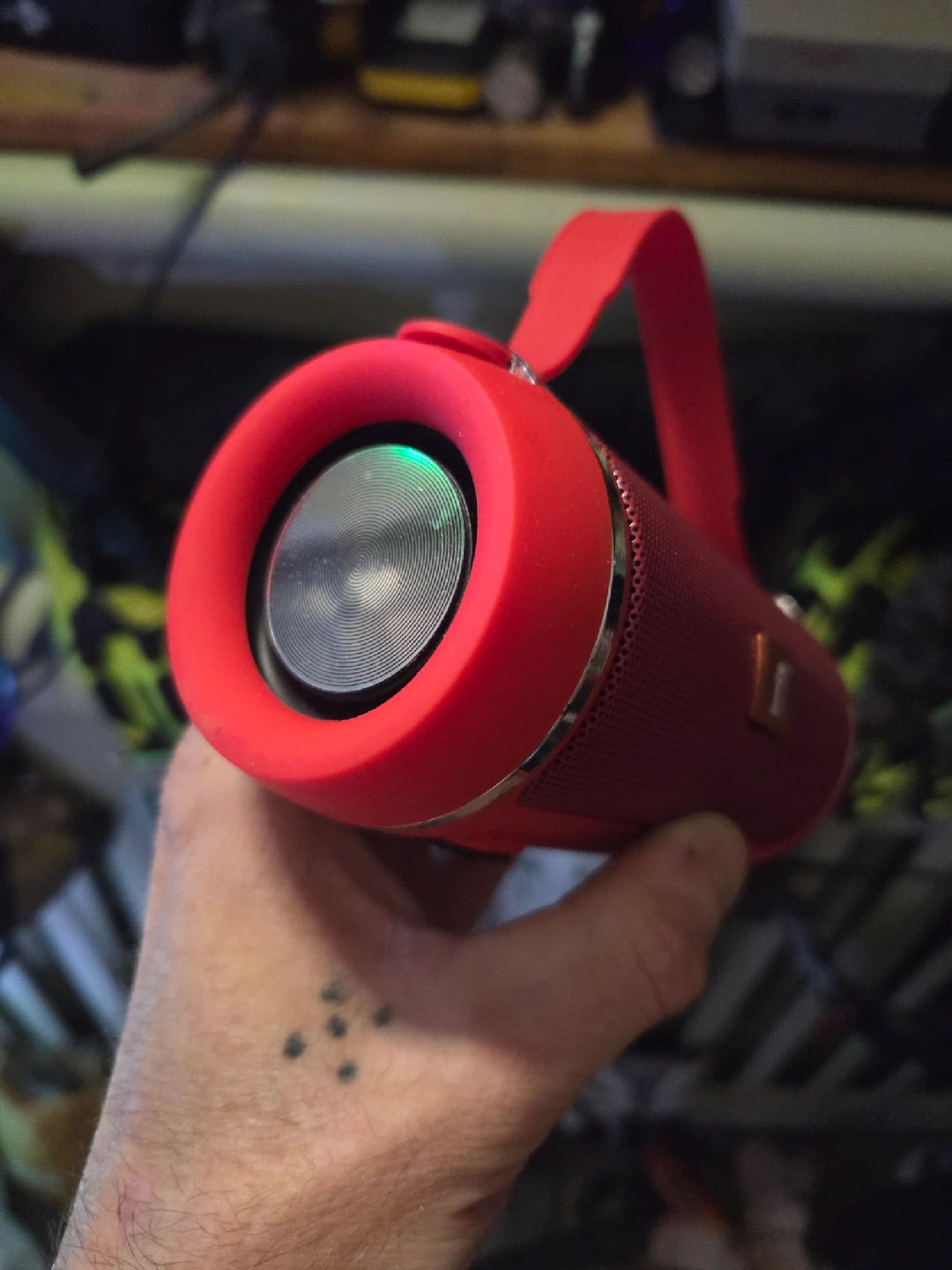 Selling a red portable Bluetooth speaker. It has a convenient carrying handle and a stylish design. Perfect for listening to your favourite tunes on the go! for its size this thing is mighty impressive