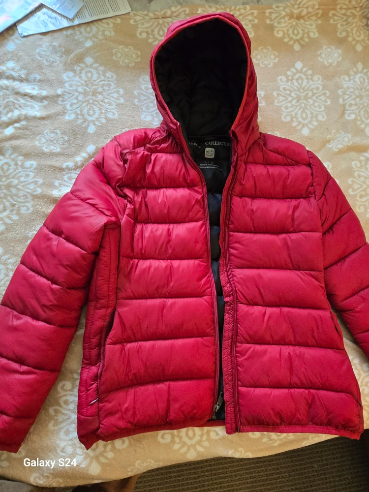 Here's a great-looking red lightweight puffer jacke! It's in good condition and ready to keep you warm this winter. The jacket features a hood and a full zip closure, perfect for those chilly days. Like new , worn once. PU Sherwood Park or can deliver close by.