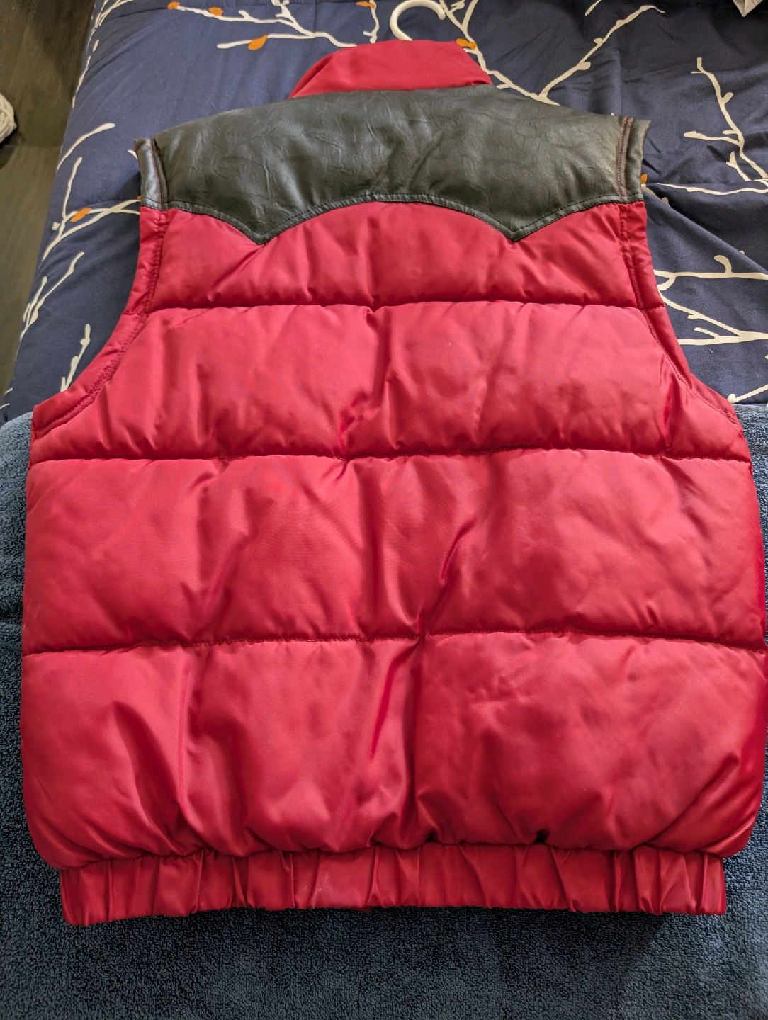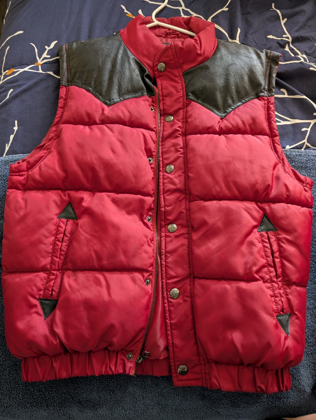 10Selling a red puffer vest, perfect for layering! It features stylish leather detailing on the shoulders and pockets. It's in great condition and ready for a new home. Keeps you warm and looking good!