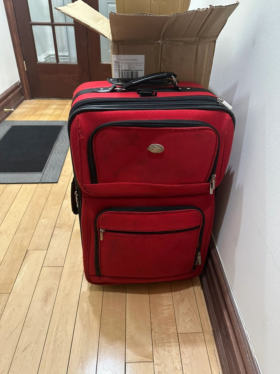 124Large red rolling suitcase. Two compartments. Wheels and handle. Some minor stains. Zippers and everything is still in good shape. I am selling this primarily because I bought another set and don’t need this one. For pick up only.