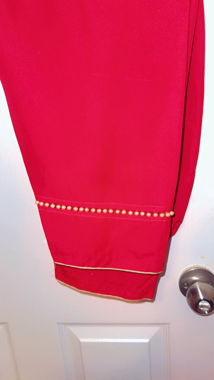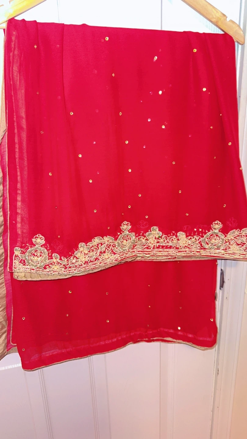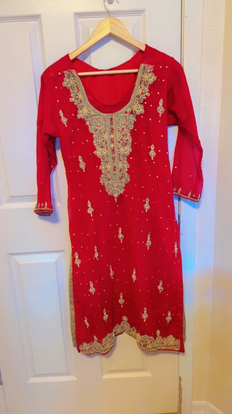 55Selling a beautiful red salwar kameez suit. It features intricate detailing and is perfect for special occasions. The fabric feels lovely and it's in great condition! The kameez looks alittle weird Bcz I have hang it on hanger