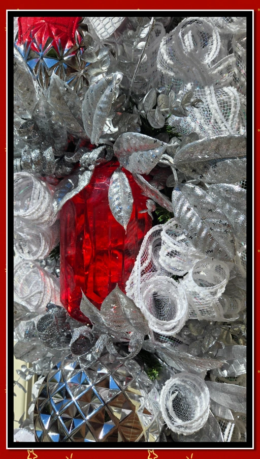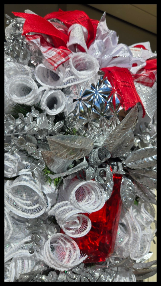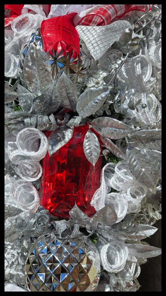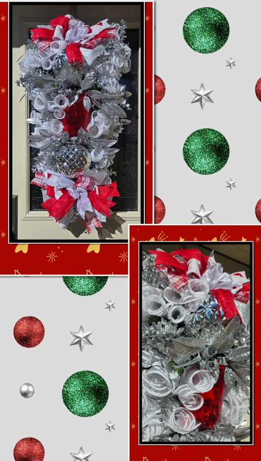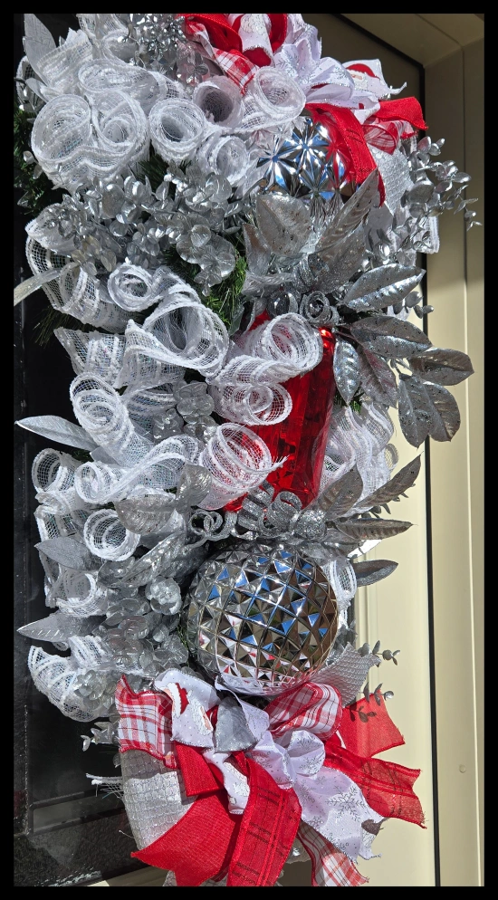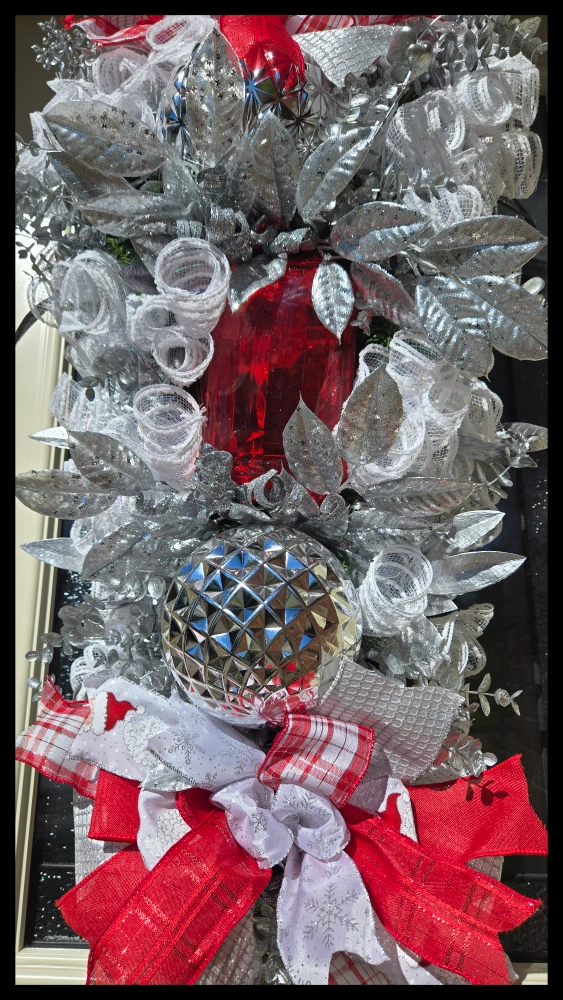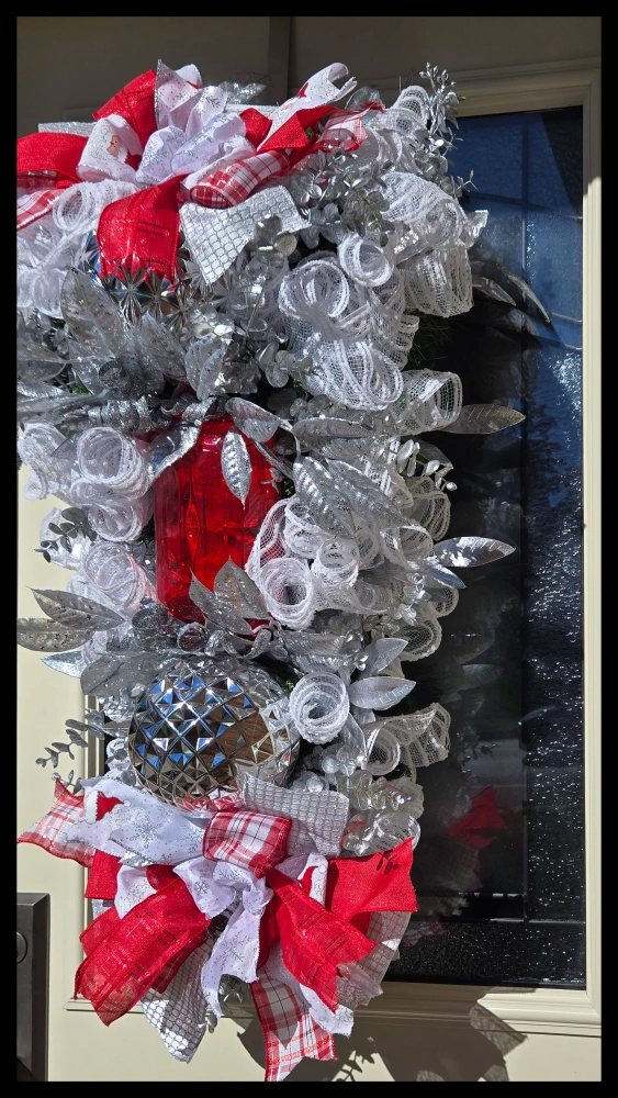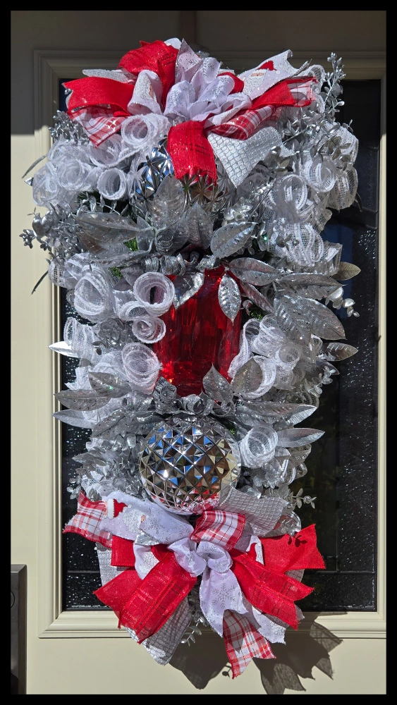10Add a touch of festive cheer to your home with this beautiful Christmas door swag! It features a lovely combination of red, silver, and white decorations, perfect for the holiday season. It's sure to make your door stand out!