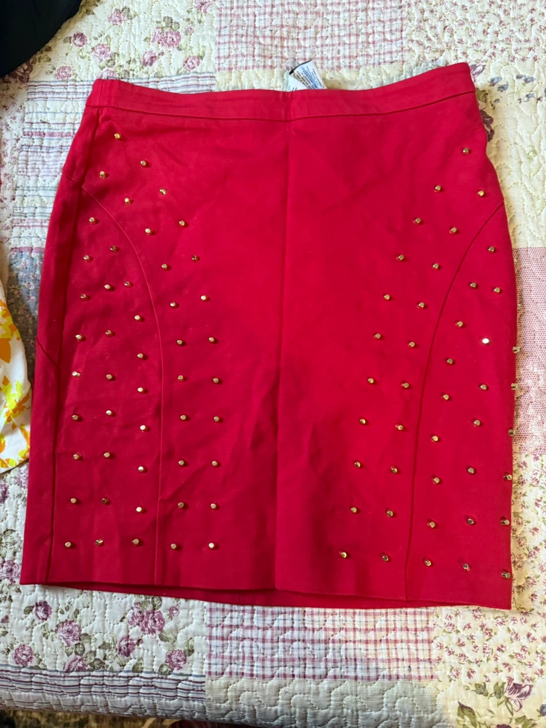 10Here's a cute red skirt with gold studs! It's in great condition and ready for a new home