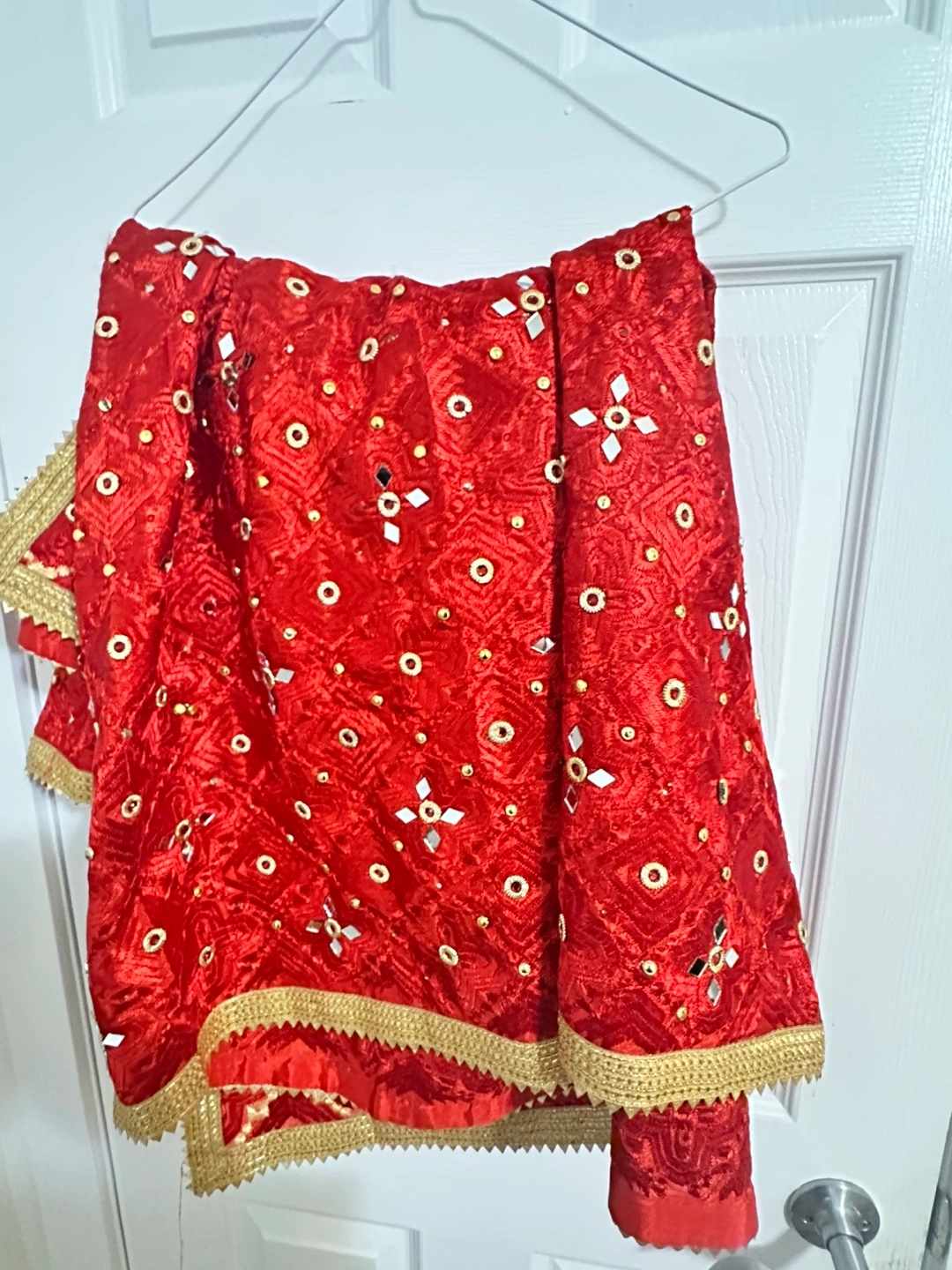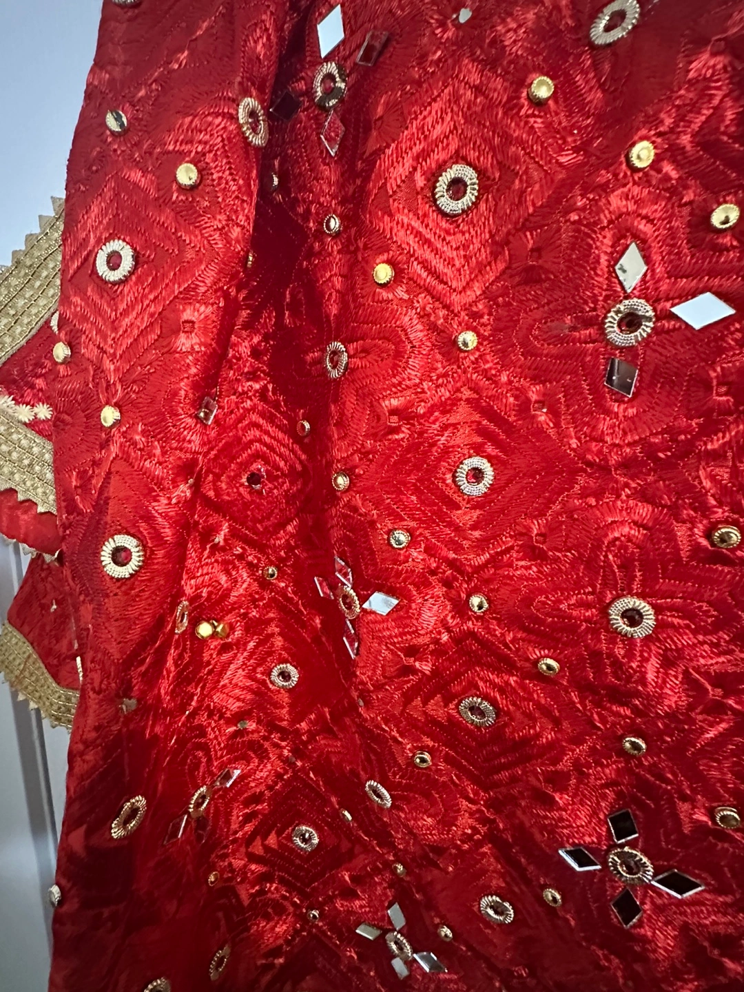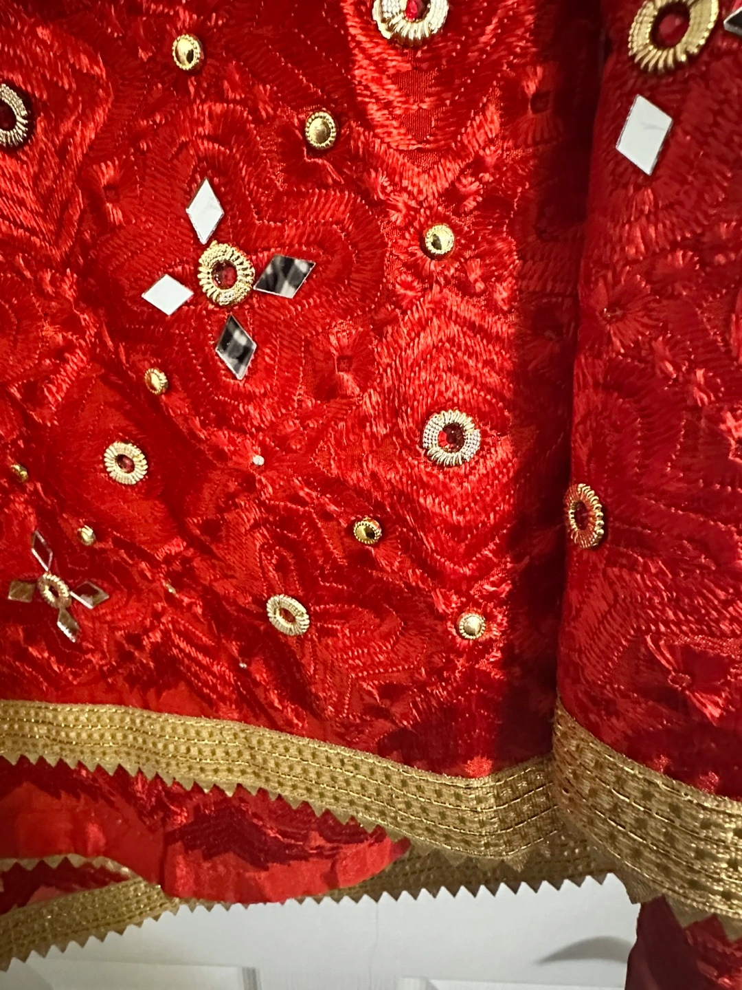 72DROP OFF FACILITY AVAILABLE $5 EXTRA. HandcraftedGorgeous red velvet dupatta. Features intricate mirror and gold embroidery work. Beautiful detailing throughout. Gold lace border. Perfect for special occasions.
