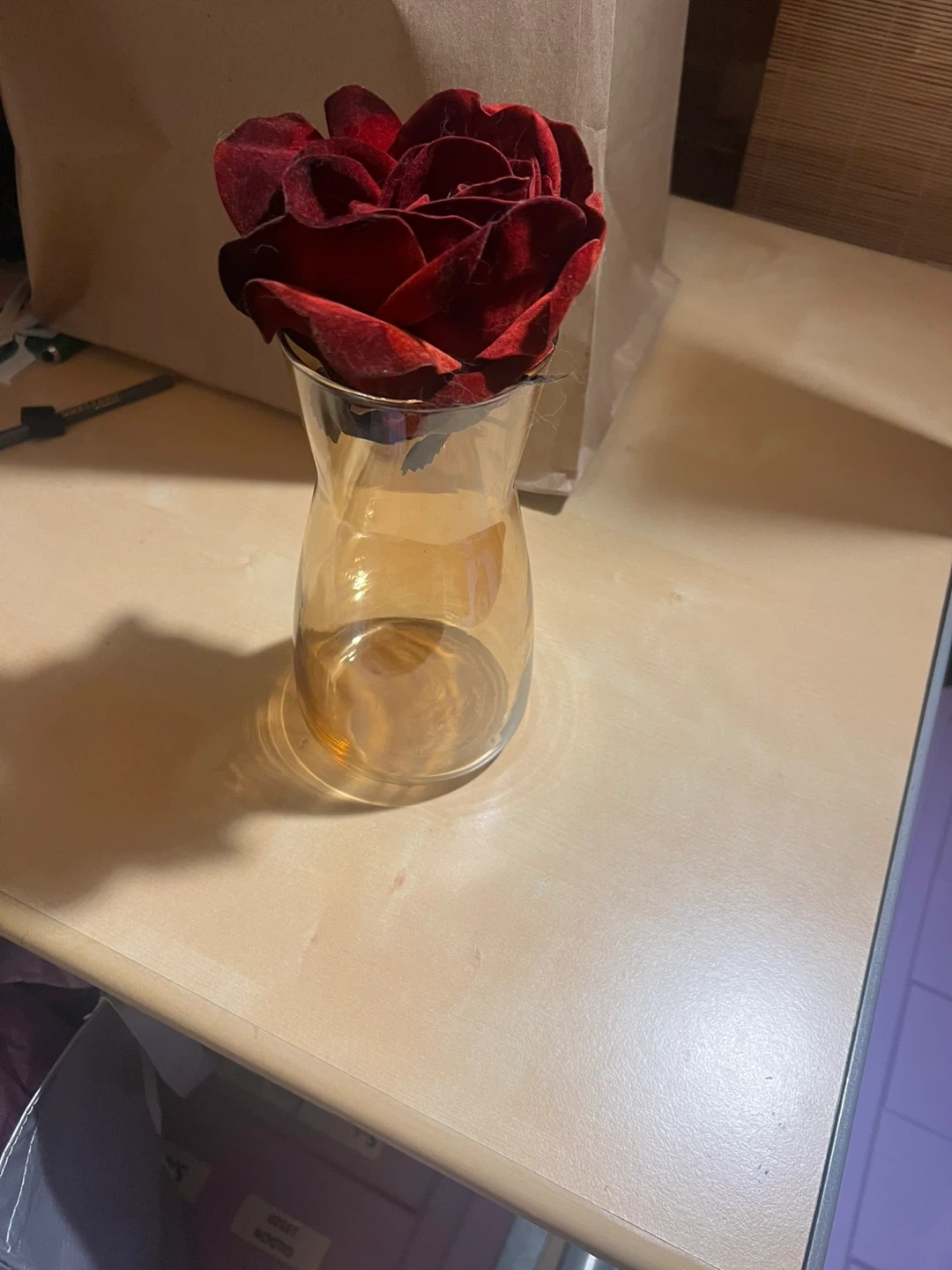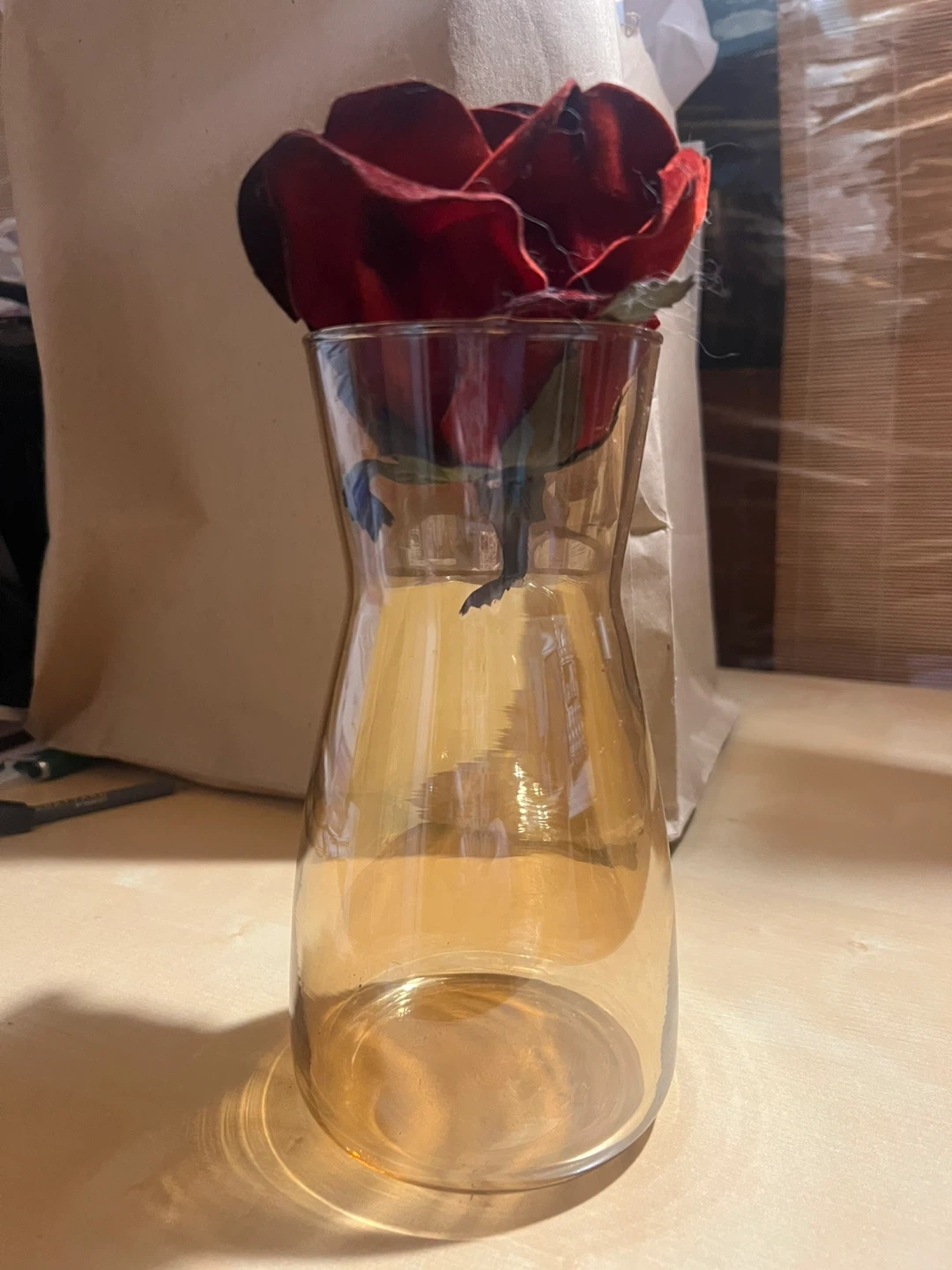A beautiful red velvet rose in a glass vase. It's a lovely decorative piece for any room