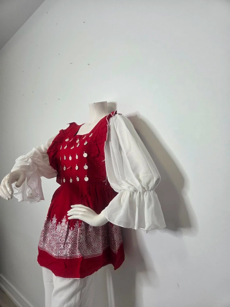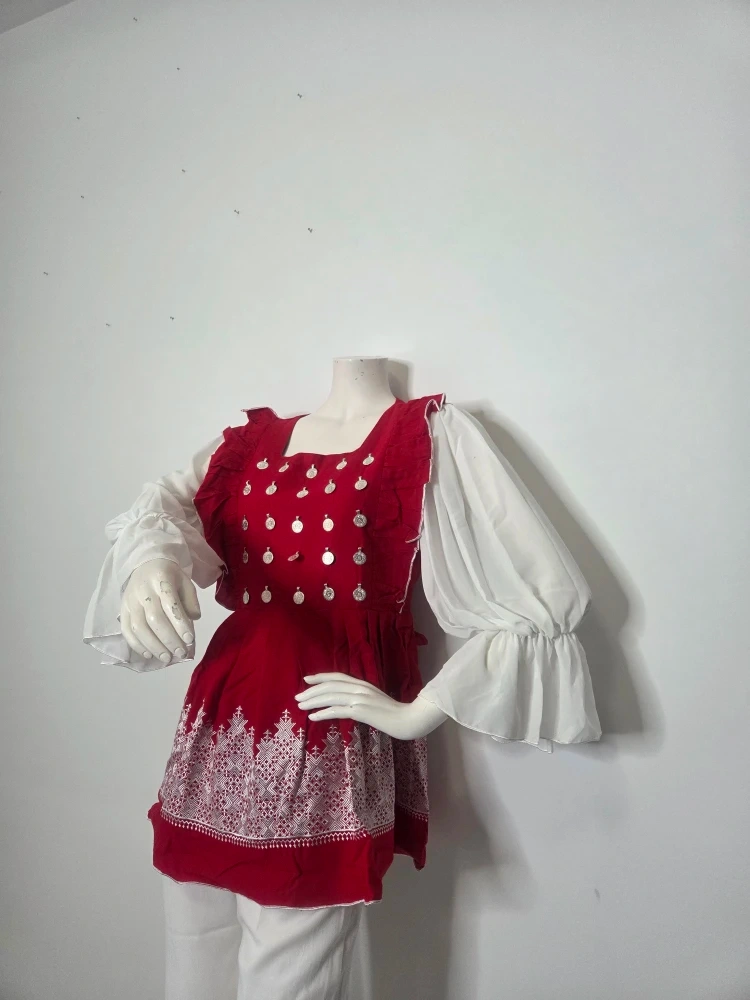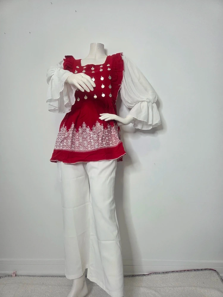 76beautiful red and white outfit with silver embellishments! The top is a lovely red with white detailing, paired with flowy white sleeves and matching white pants. Perfect for adding a pop of colour to your wardrobe
