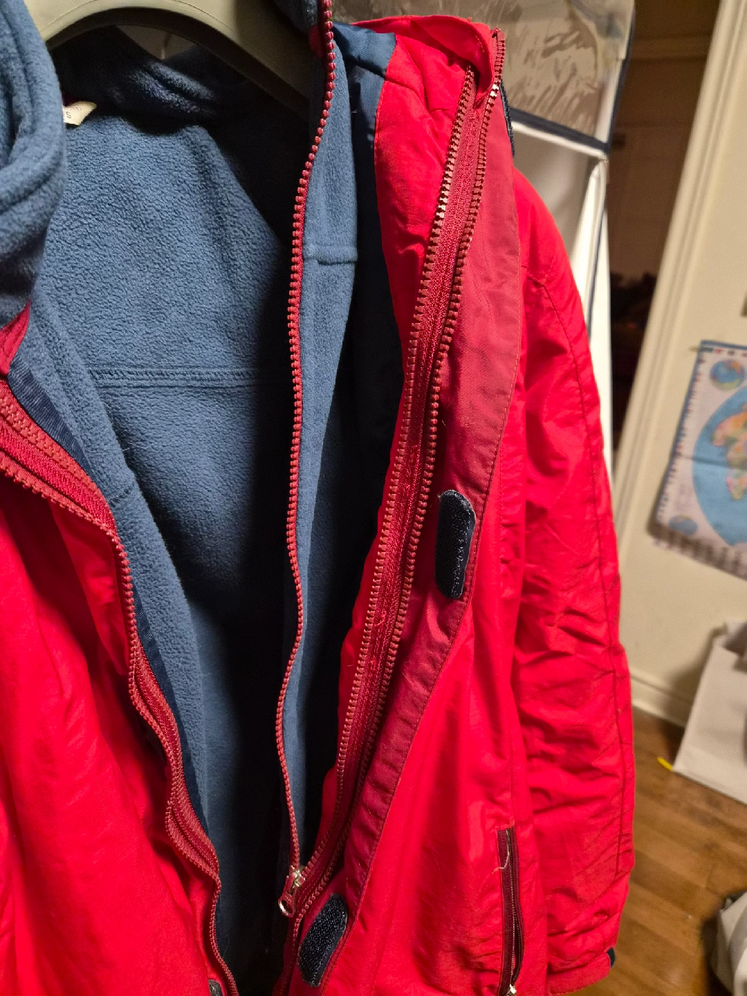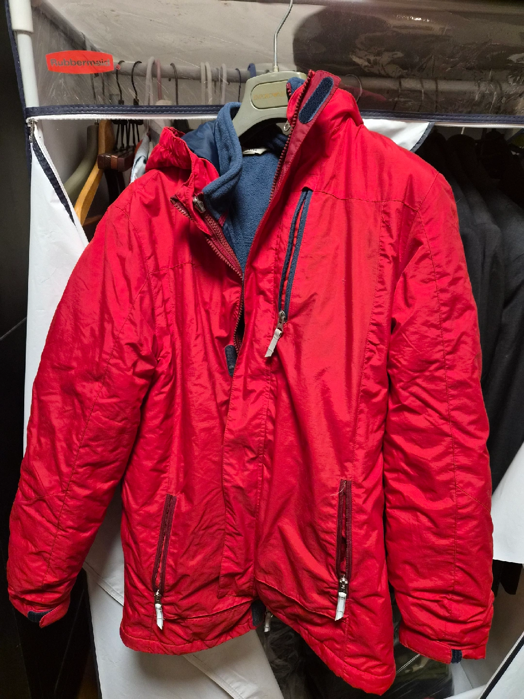 53Selling a red winter jacket. It's in great condition and perfect for the cold weather. It features a blue fleece lining for extra warmth.