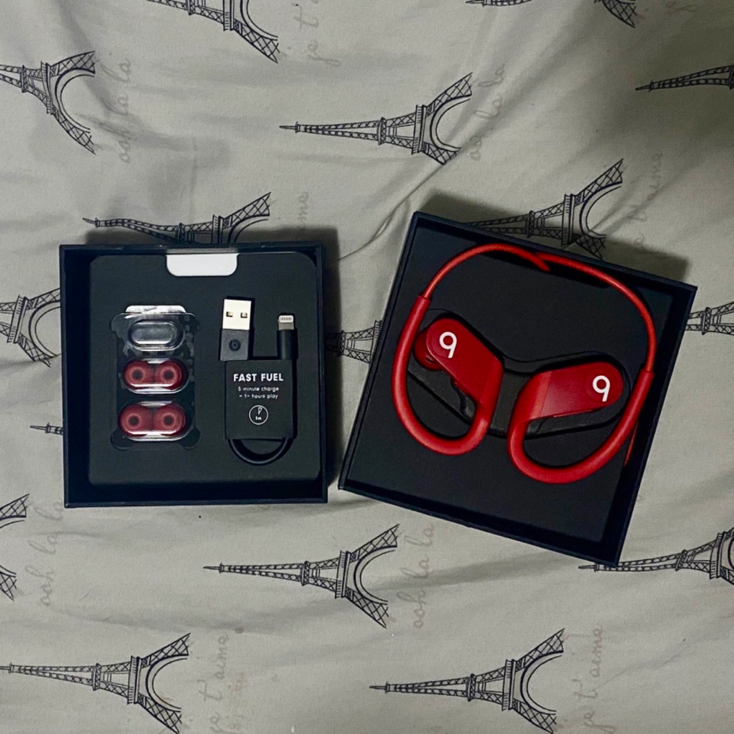 65Wireless earbuds with charging cable. Earbuds come with size adjustments.