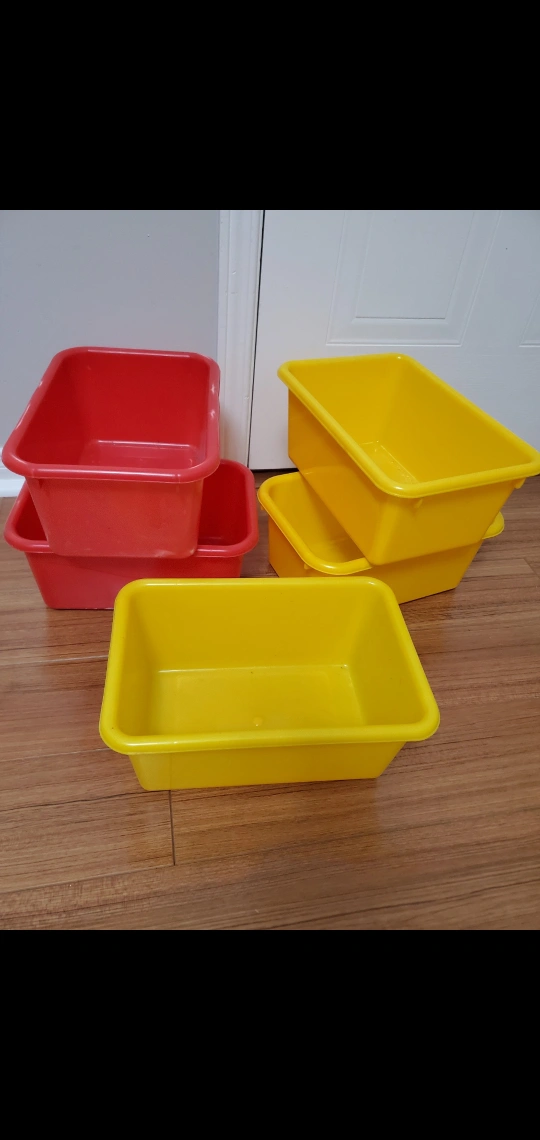 Selling a set of red and yellow plastic storage bins. They're perfect for organizing toys, crafts, or anything else you need to store. They are in great condition and ready for a new home! smoke free compatible with a toy organizer