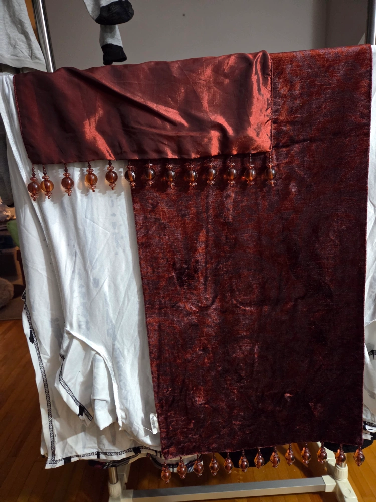 83Selling a reddish brown velvet table runner! It features a smooth velvet fabric top and a textured fabric on the underside. The runner is finished with a beaded trim, adding a touch of elegance to your table setting. Perfect for the Christmas season!