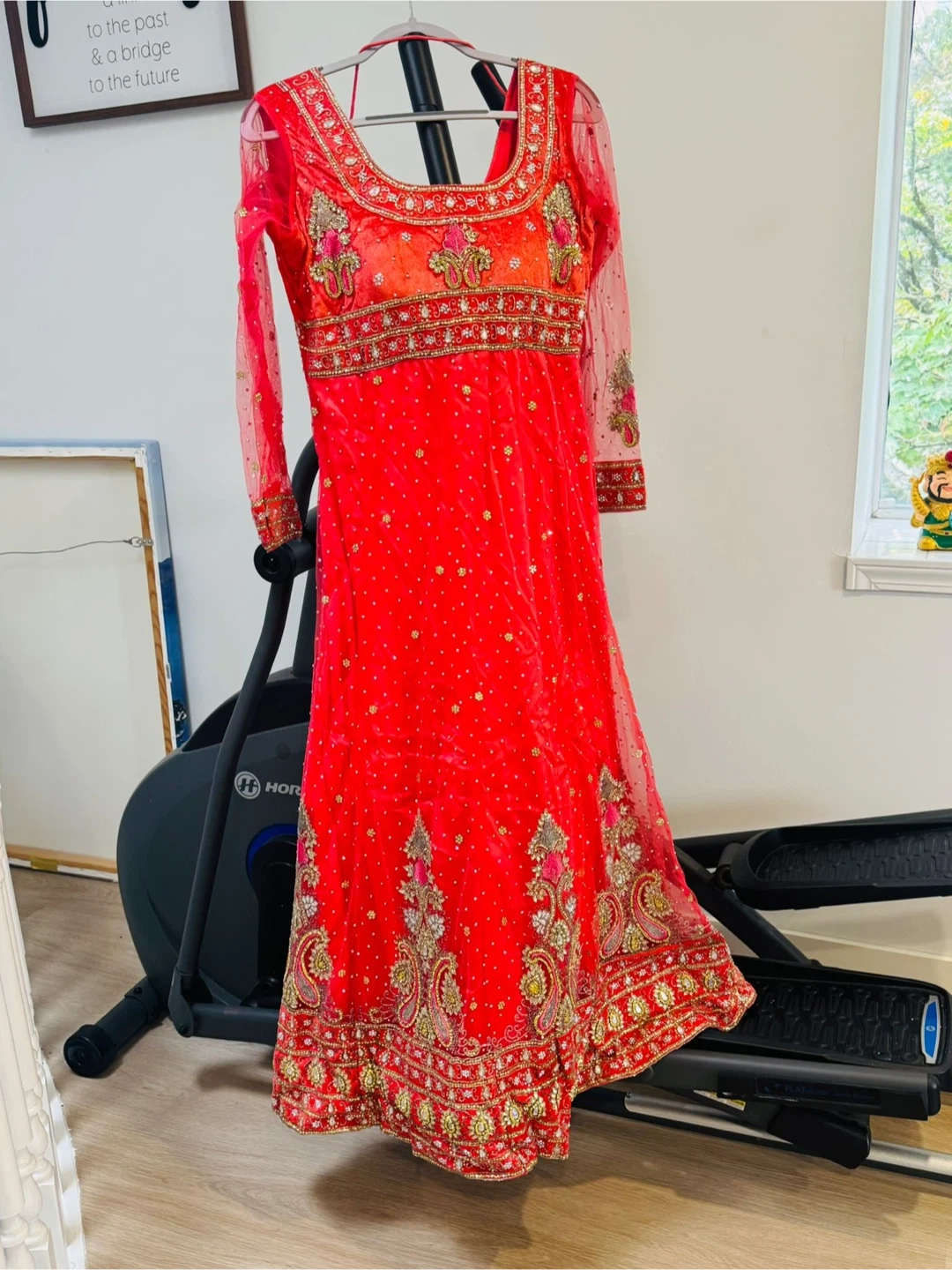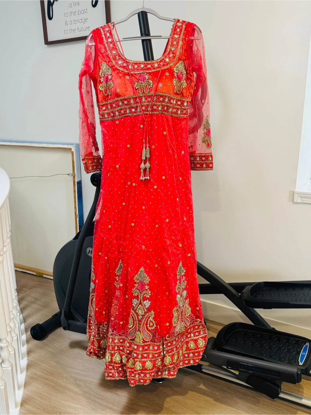 Beautiful reddish peach dress with intricate gold embroidery. Perfect for a special occasion! The dress features long sleeves and a flowing skirt in valves and net fabric with satin base liner. It's in great condition and ready for a new home. only wear 1 time.