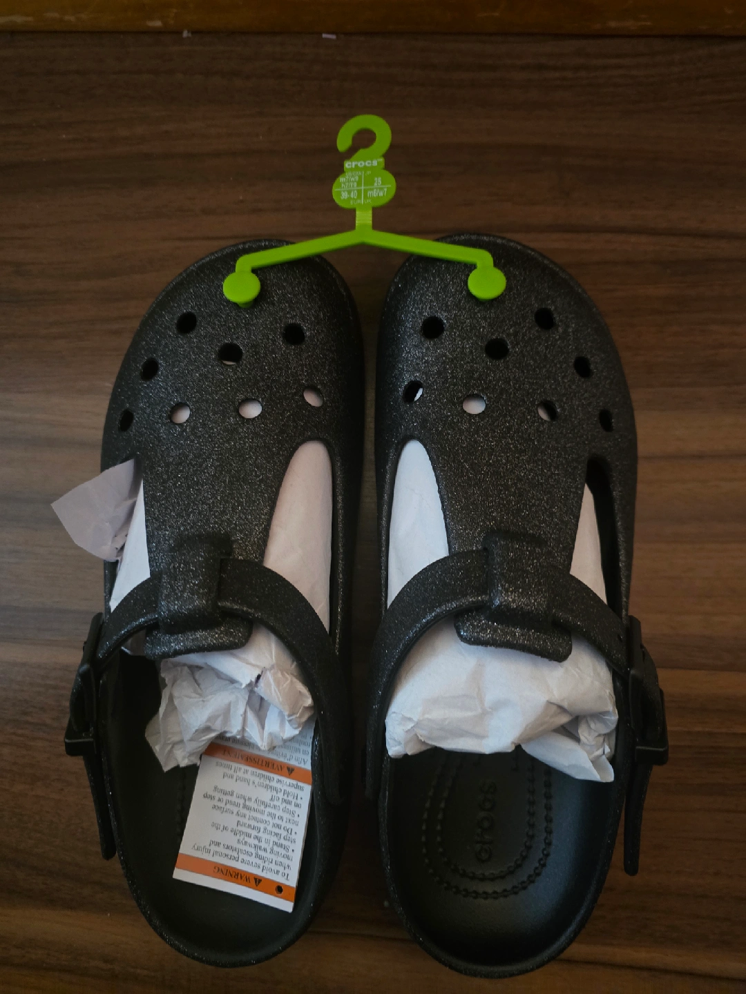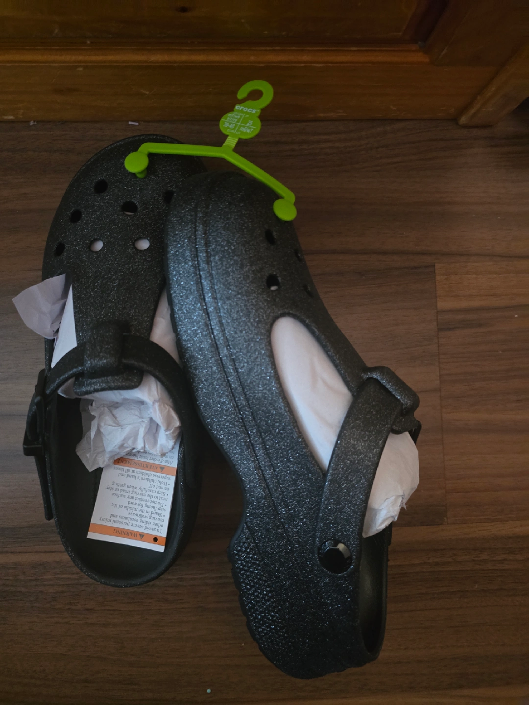 65reduced for quick sale Selling a brand new, NEVER WORN, pair of Crocs Classic Mary Jane Glitter Clogs in black! These are a women's size 9 (M7/W9). Retails for $74.99 at Crocs. They can be yours for $50 obo.