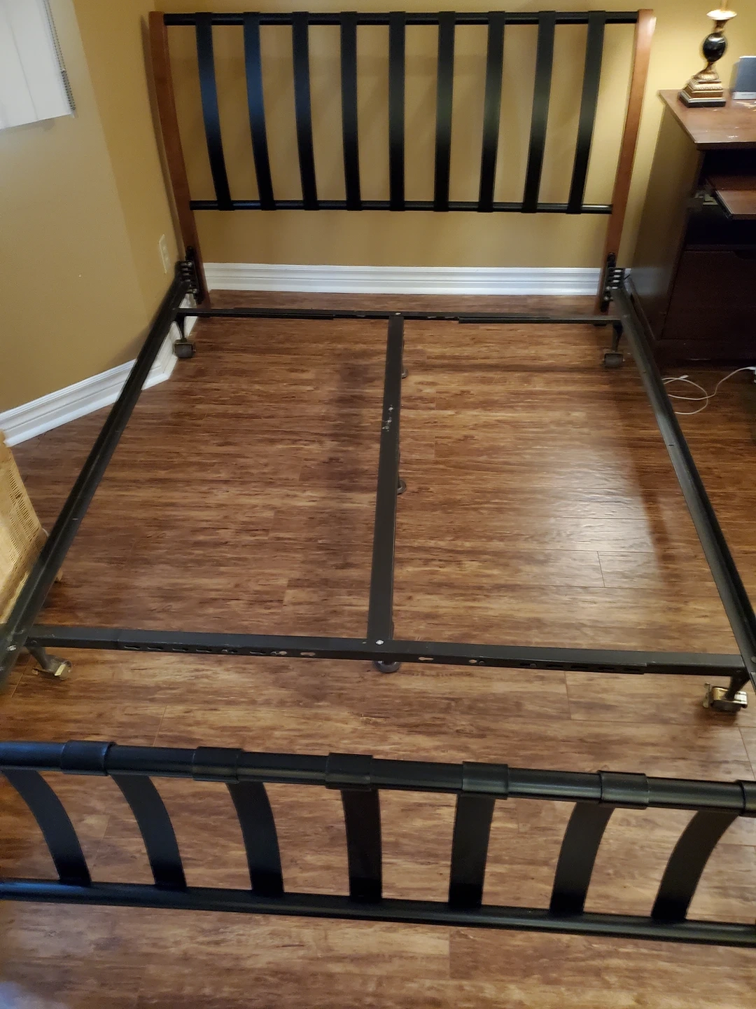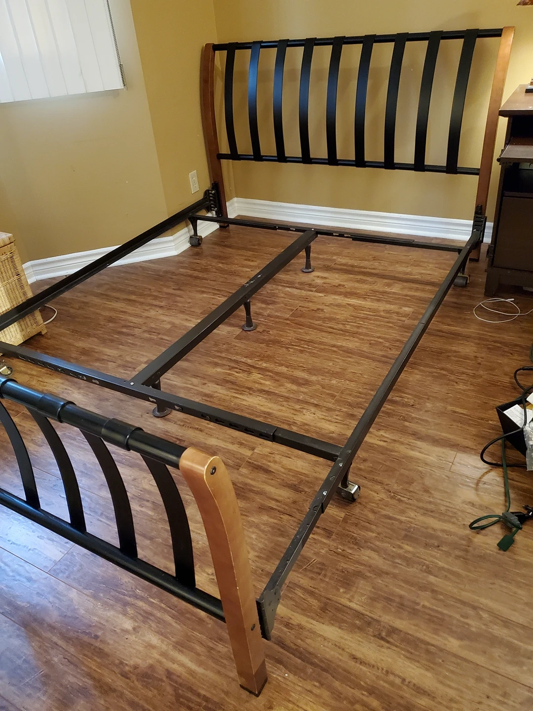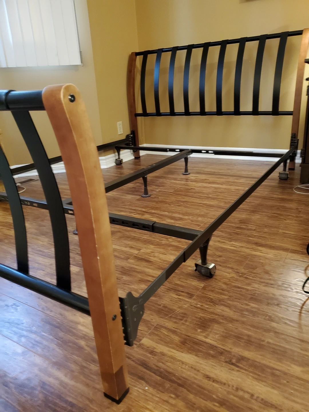 Elegant Sleigh Style Queen Head and Foot Boards. Comes with sturdy adjustable metal bed frame. Disassembled and ready to go for quick pick up.
