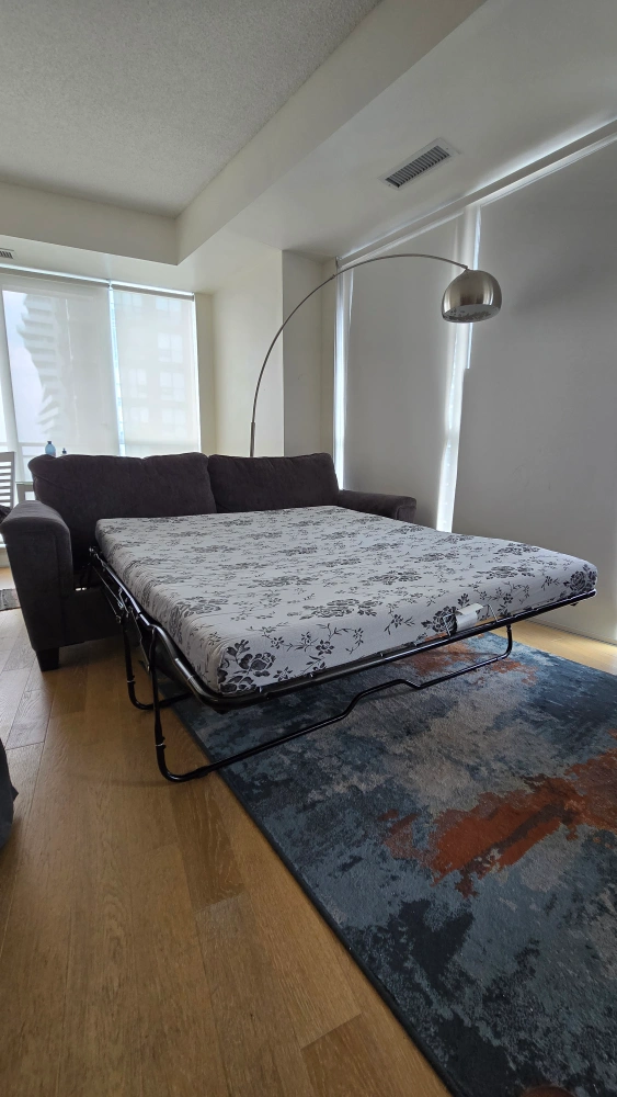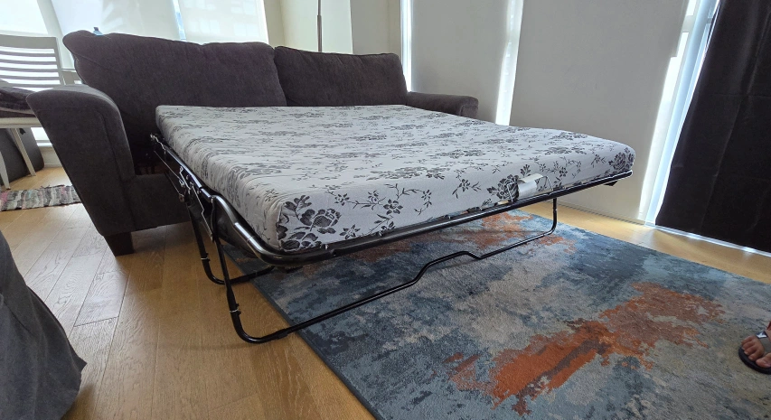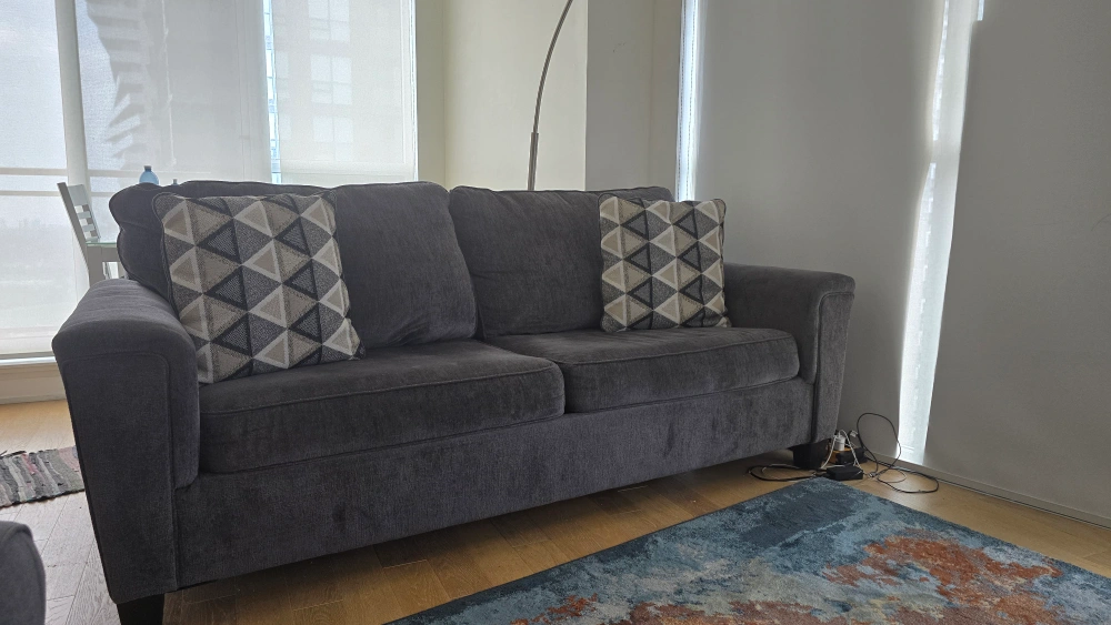 Selling a Ashley comfy grey sofa queen sized bed with two cushions! It's in great condition and perfect for guests or small spaces. The sofa easily converts into a bed, making it super versatile for any home