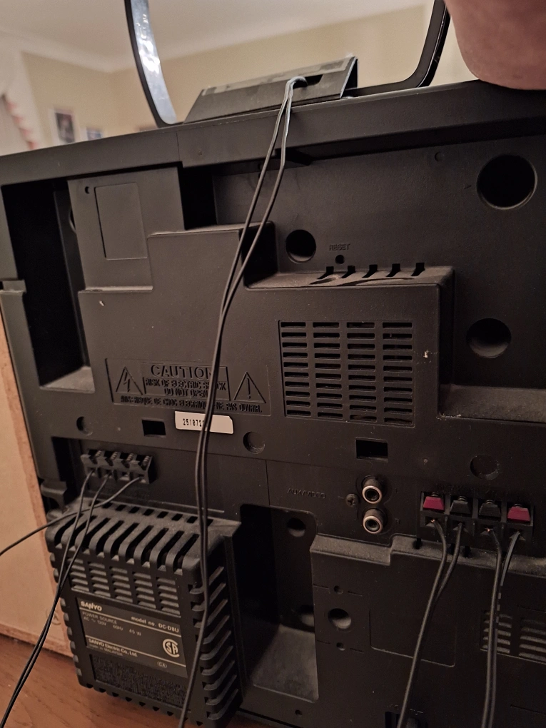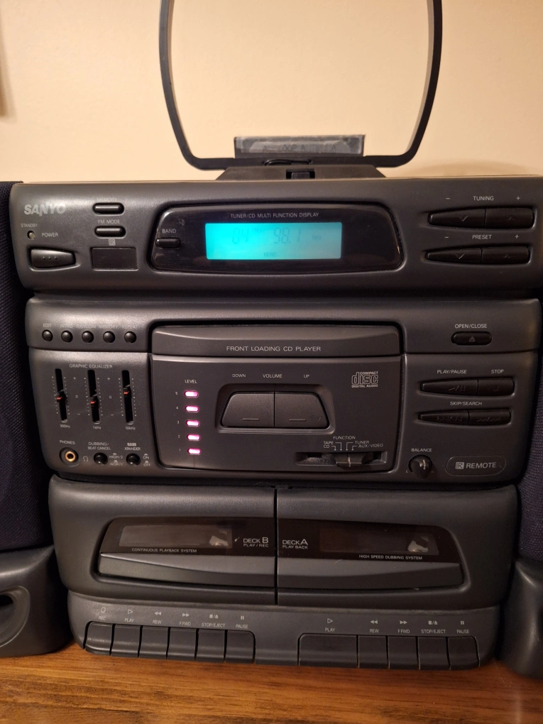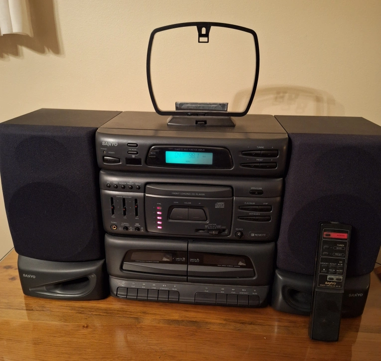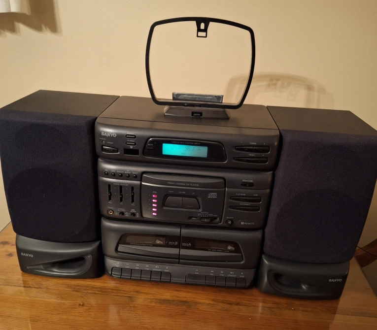 Sanyo Mini Stereo System. Model No. DC-D8U. Power source AC, 120V, 60Hz, 45W. Two speakers model no. SX-D8. C/D player, dual cassette, AM/FM radio. AM antenna, FM antenna, remote. Pickup Scarborough Pharmacy/Ellesmere area. Cross posted