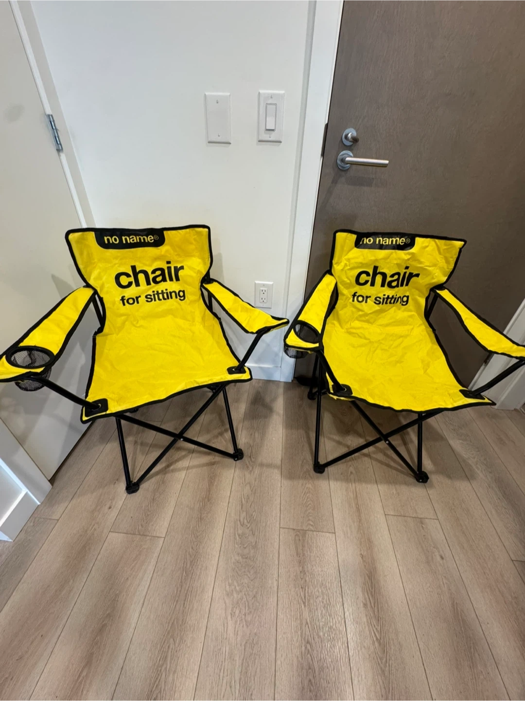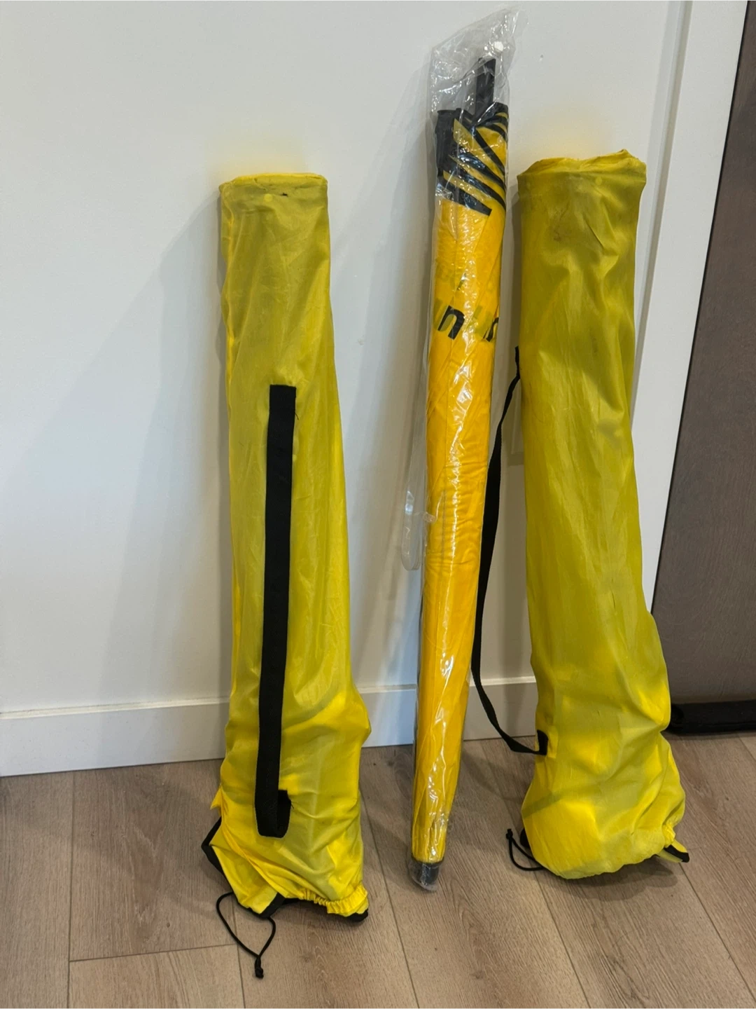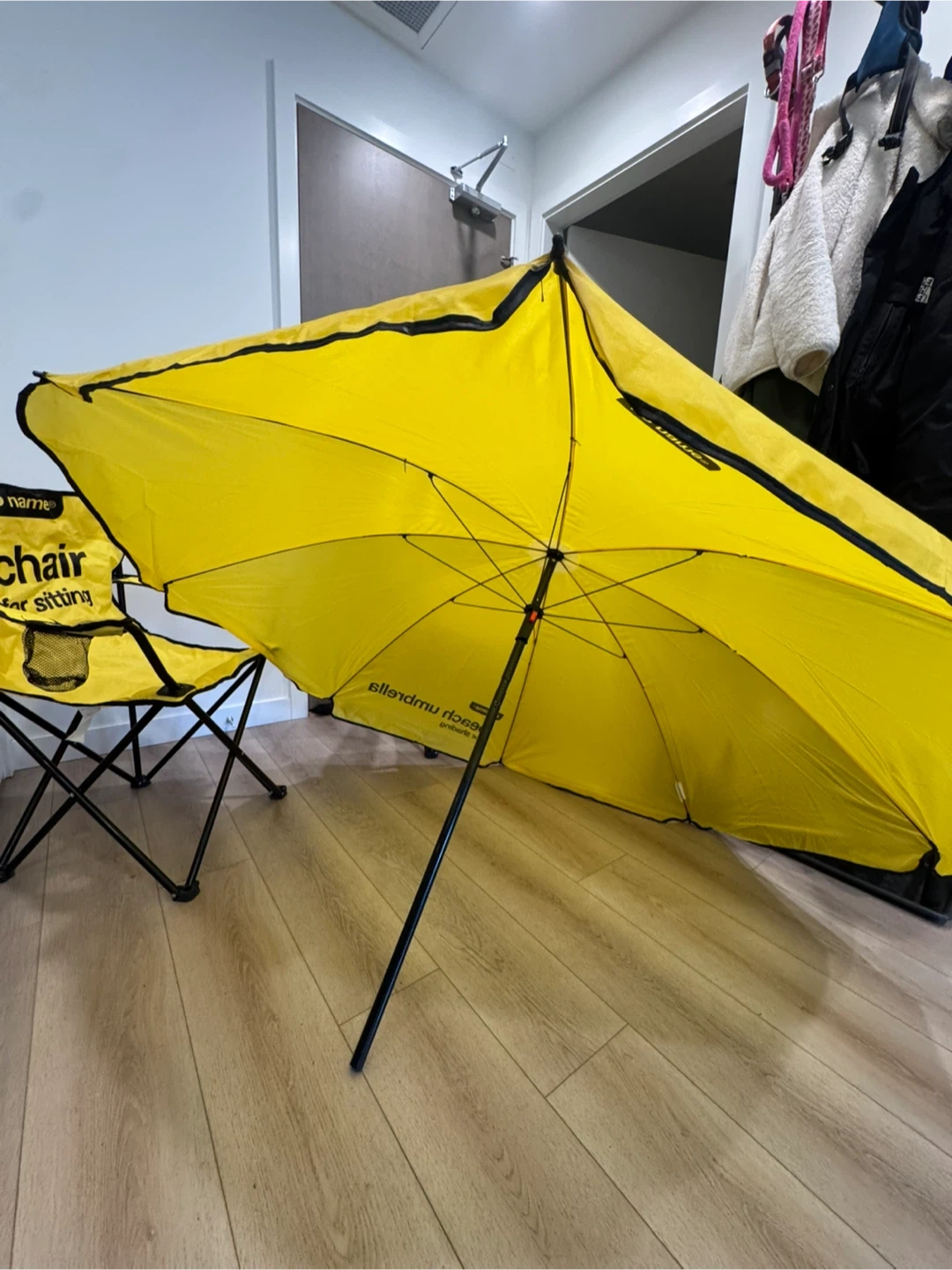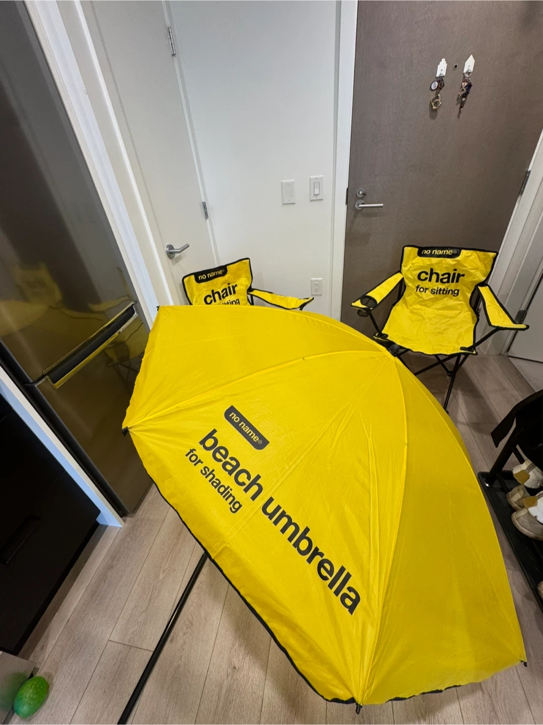 This set includes 2 yellow beach or camping chairs and a beach umbrella. Foldable and come with carrying bags.