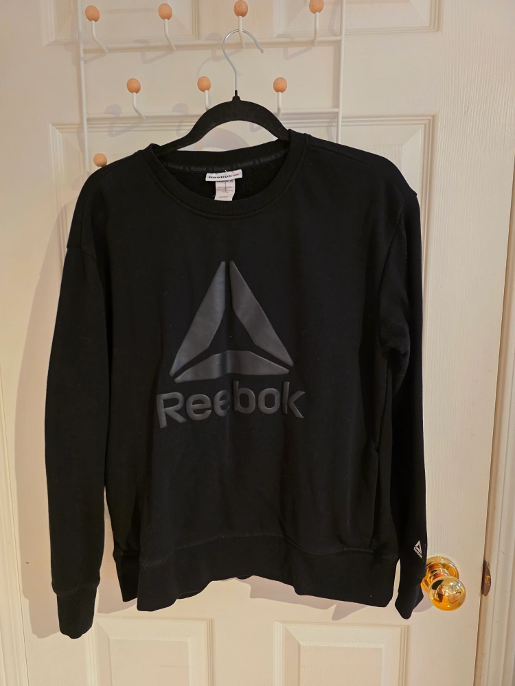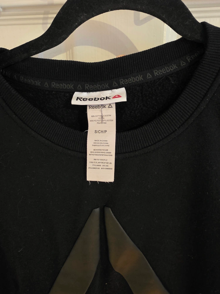 49Selling a Reebok crewneck sweatshirt in black! It's in great condition and a size small. The material is a blend of 60% cotton and 40% polyester. Perfect for staying cozy!