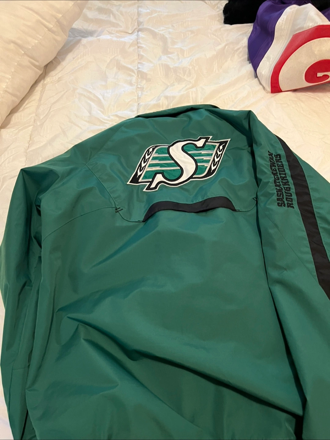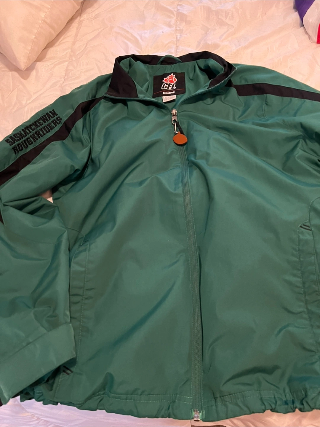 Selling a Reebok CFL Saskatchewan Roughriders jacket. It's green with black accents and the team logo. Great for showing your team spirit!