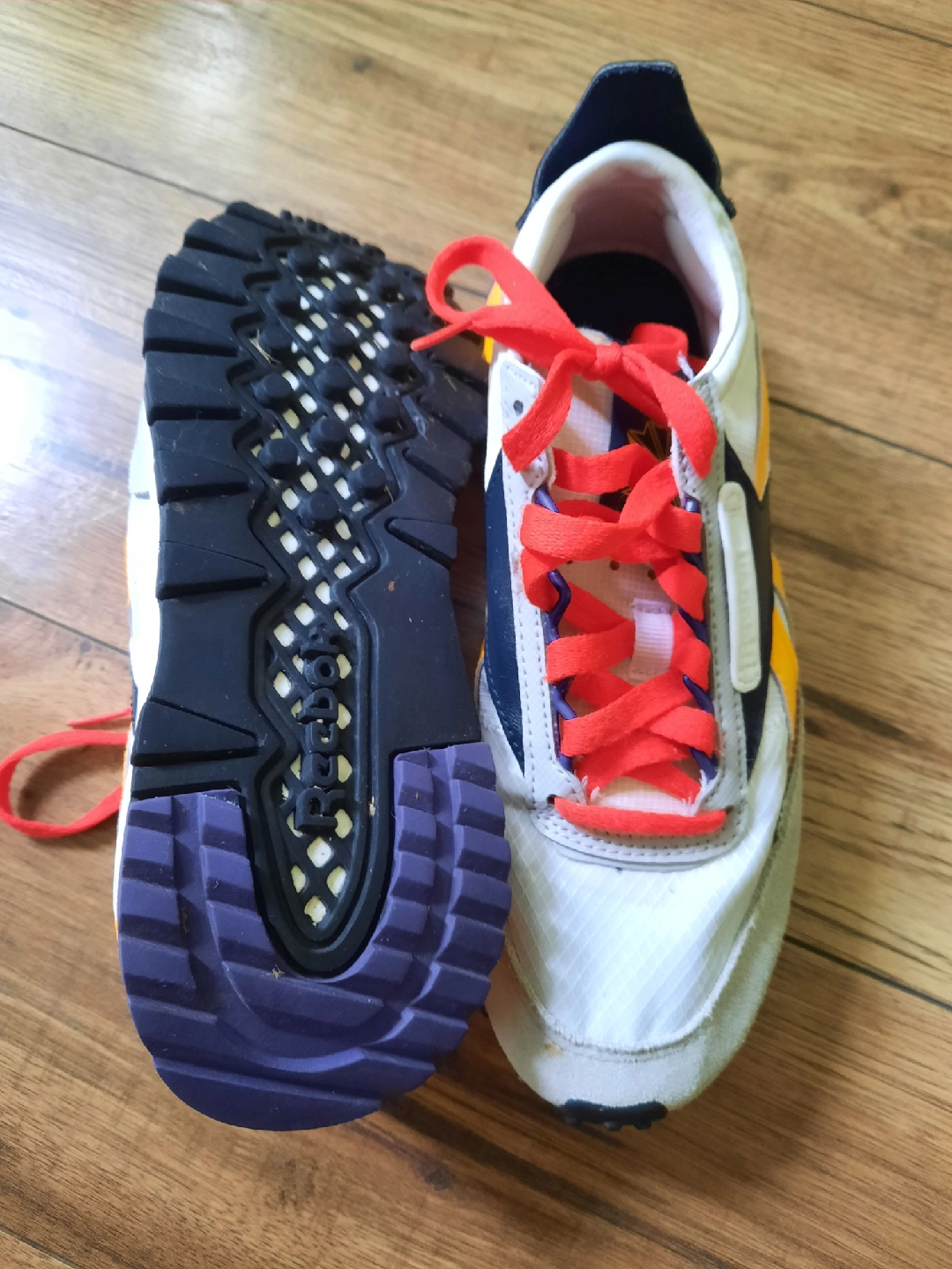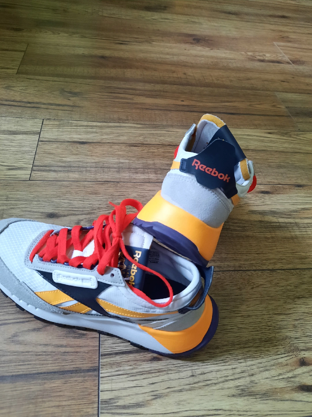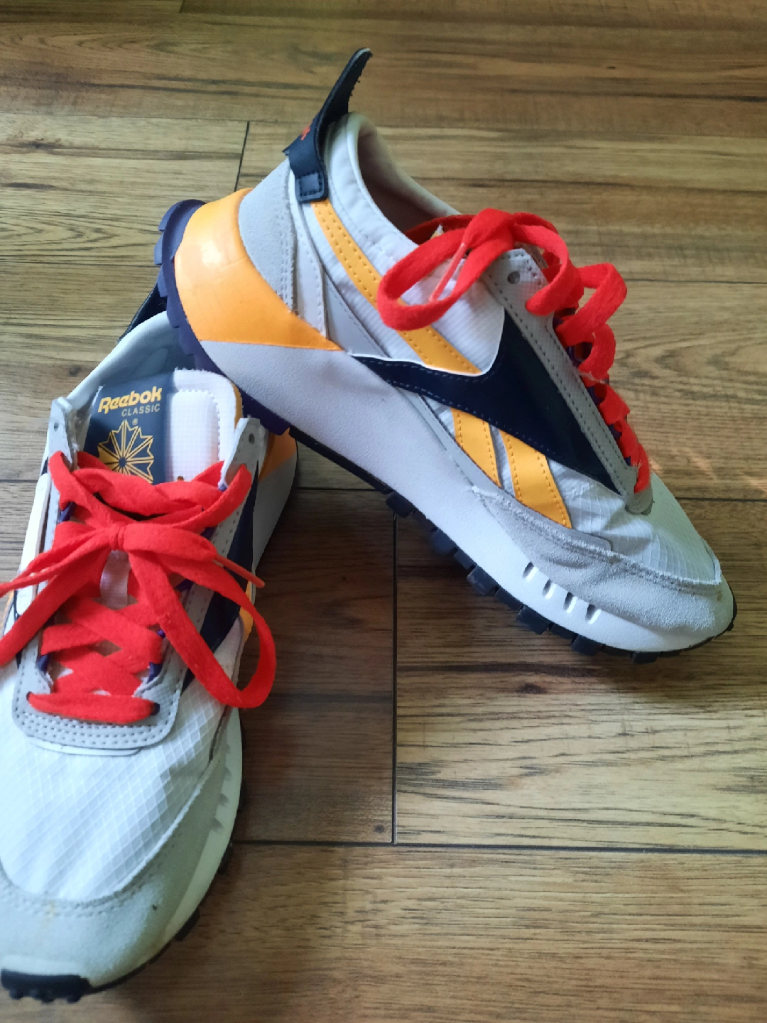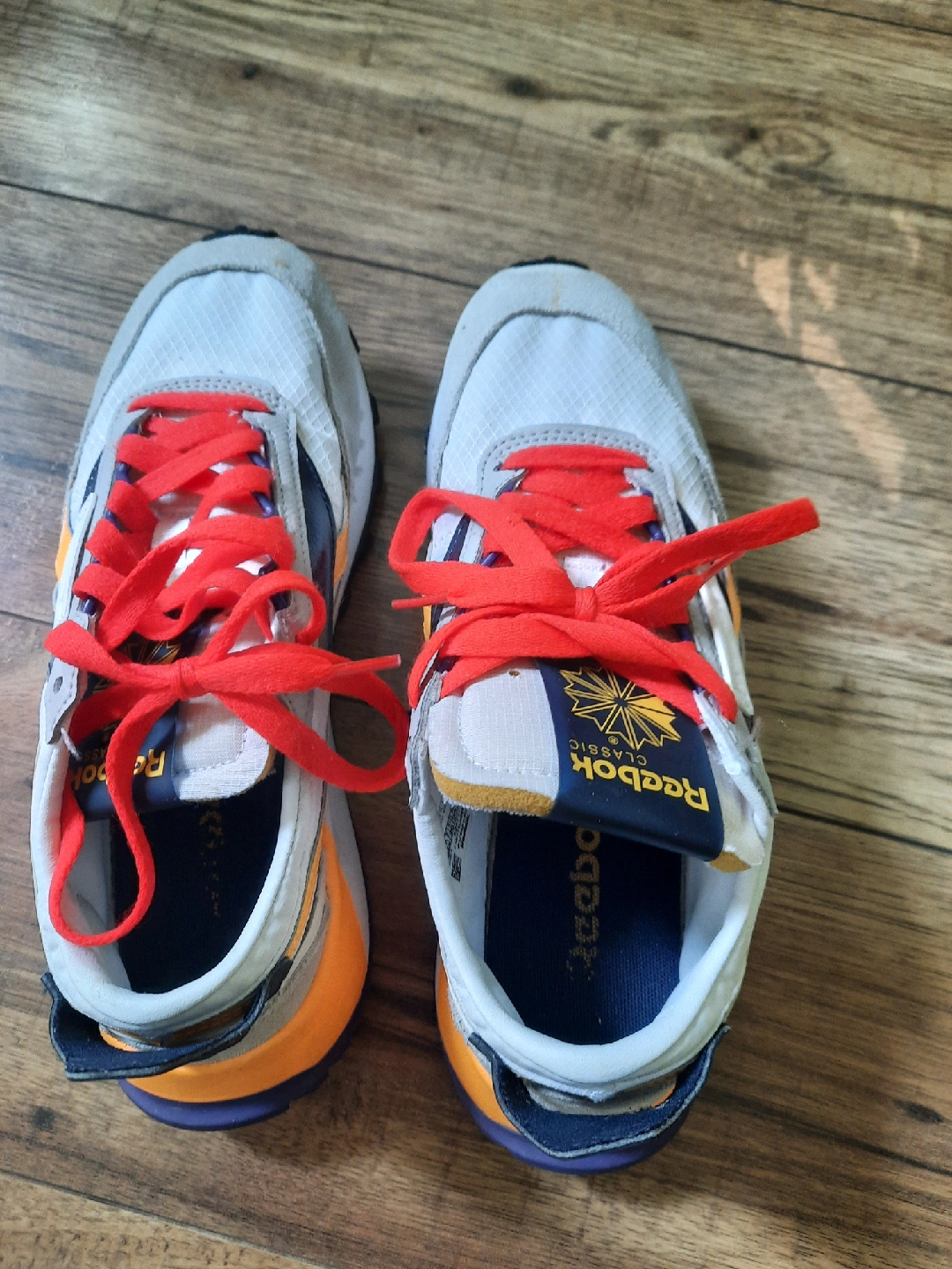 Selling a pair of Reebok Classic sneakers! They're in great shape and ready for a new home. The colours are white, grey, yellow, and navy blue with red laces. The soles are black and purple. Perfect for adding a pop of colour to your everyday look!