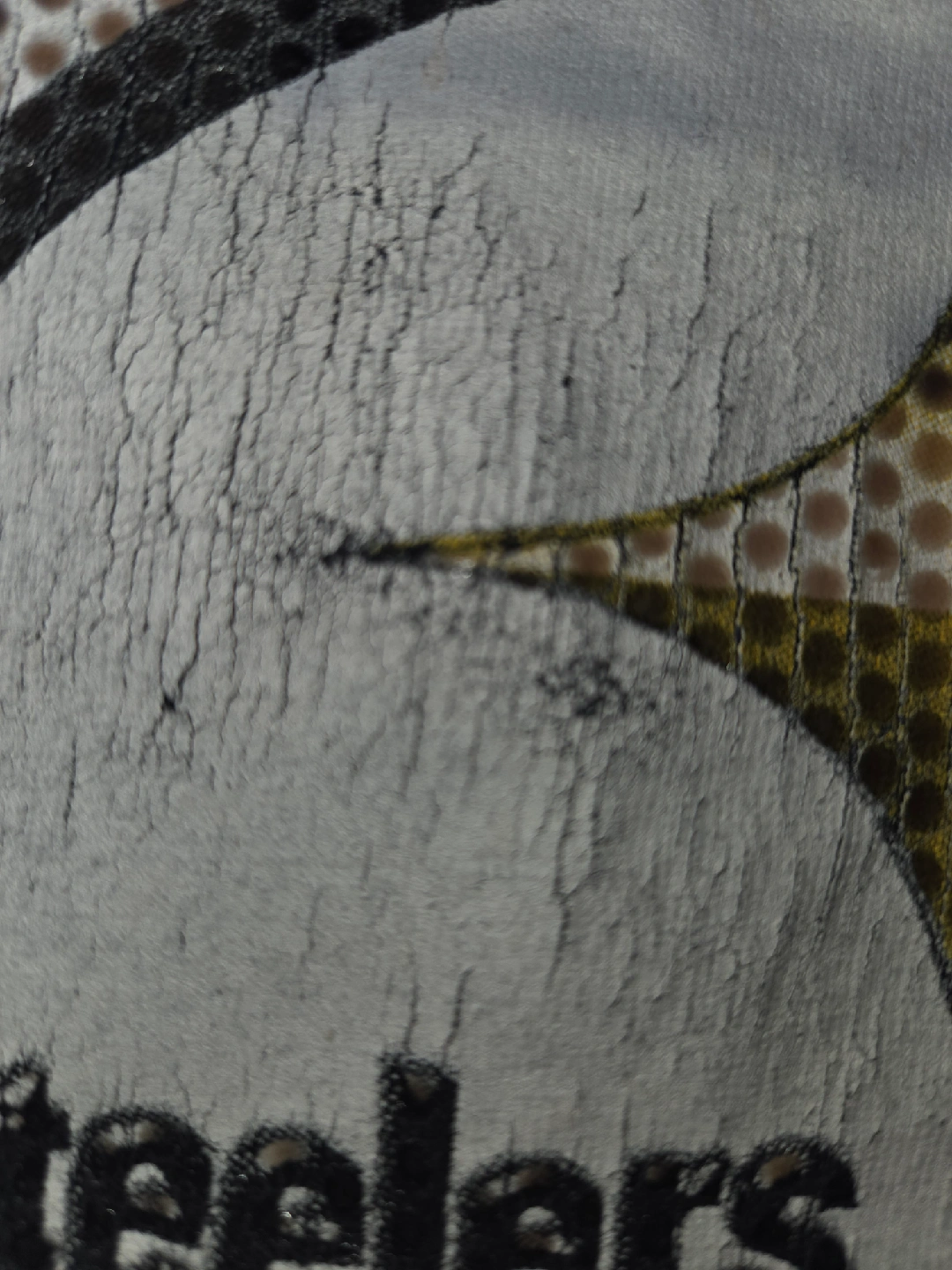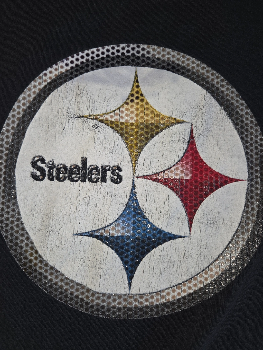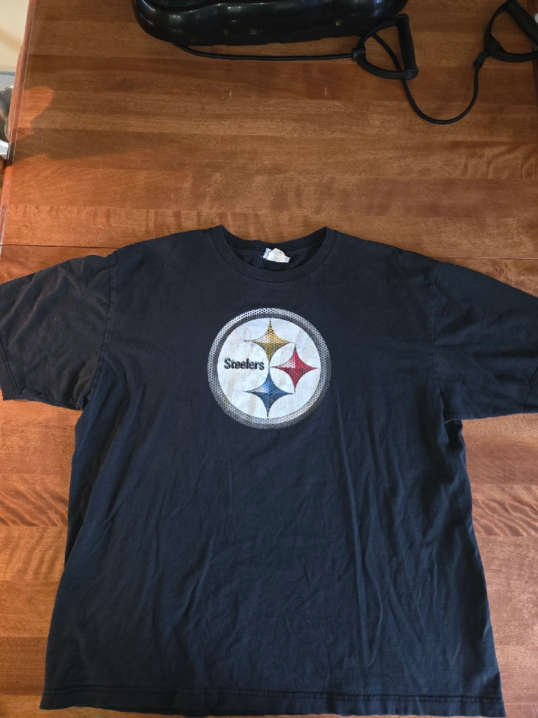 10Selling a Reebok Steelers T-shirt in size XXL. The shirt is made of 100% cotton and was made in Canada. The logo on the front shows some wear.