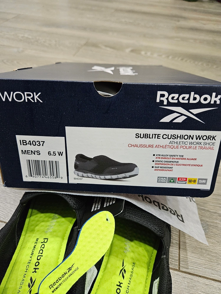 694Selling a pair of new Reebok Sublite Cushion Work Shoes! These are men's size 6.5W and come with the original box. They feature a slip-resistant design and memory tech massage for extra comfort.