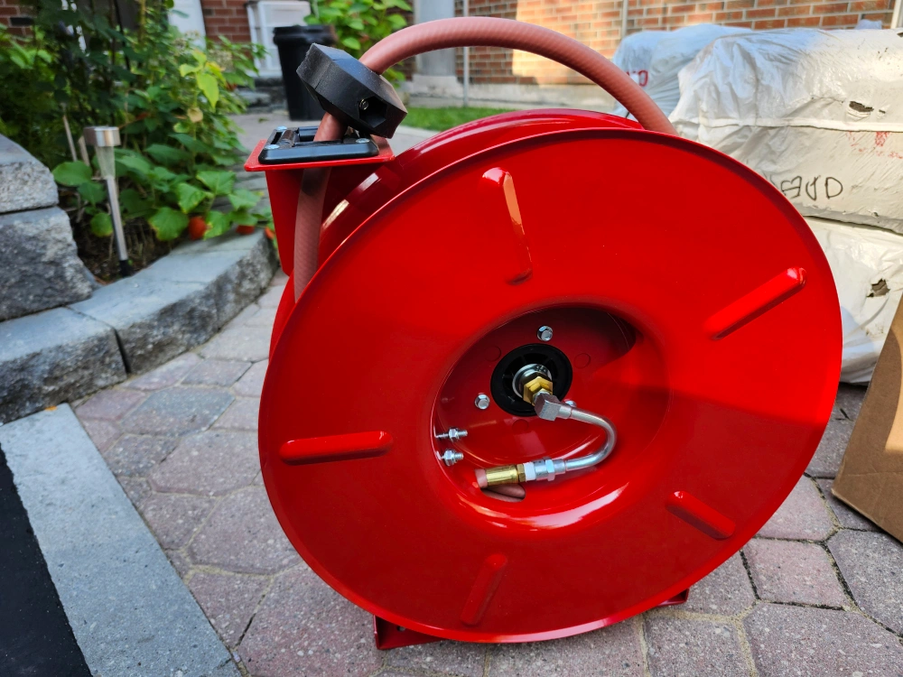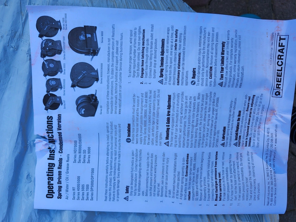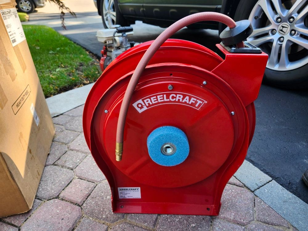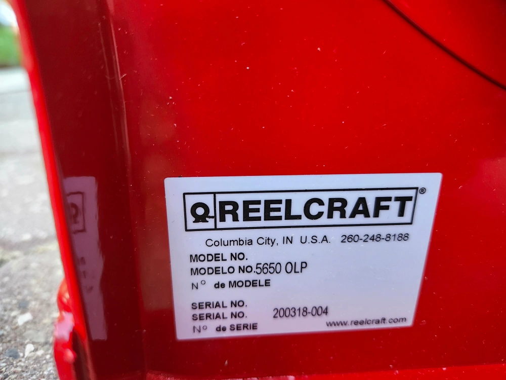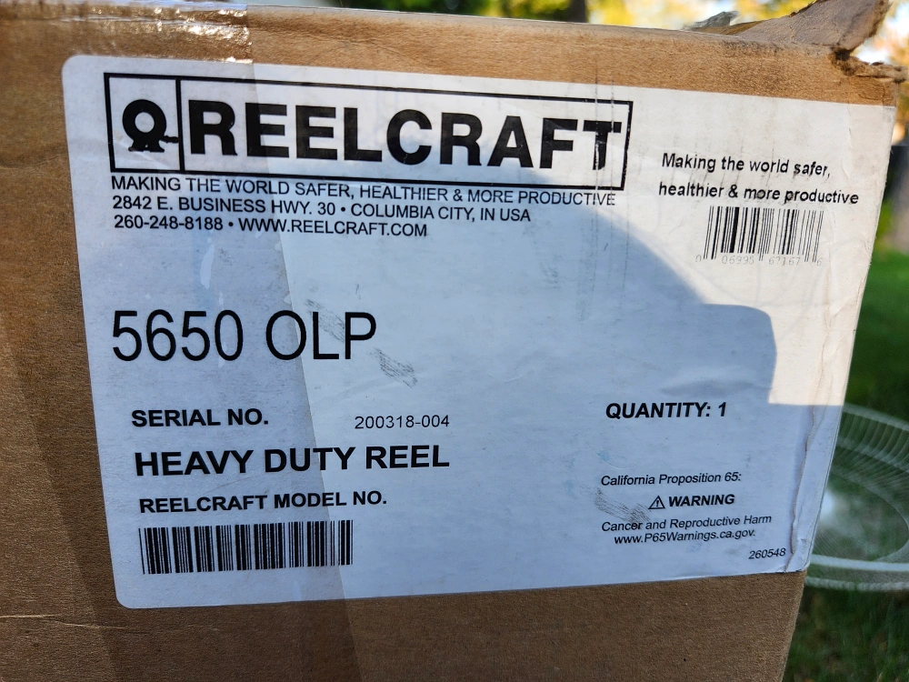 Brand new - never used Offering a Reelcraft 5650 OLP heavy-duty reel, perfect for managing air hoses or other lines in your workshop or garage. This robust reel is designed for durability and ease of use, ensuring your workspace stays organized and safe. It has a spring-powered automatic rewind, and a multi-position lock. Here are some details: * Model: 5650-OLP * Heavy-Duty * Automatic Rewind