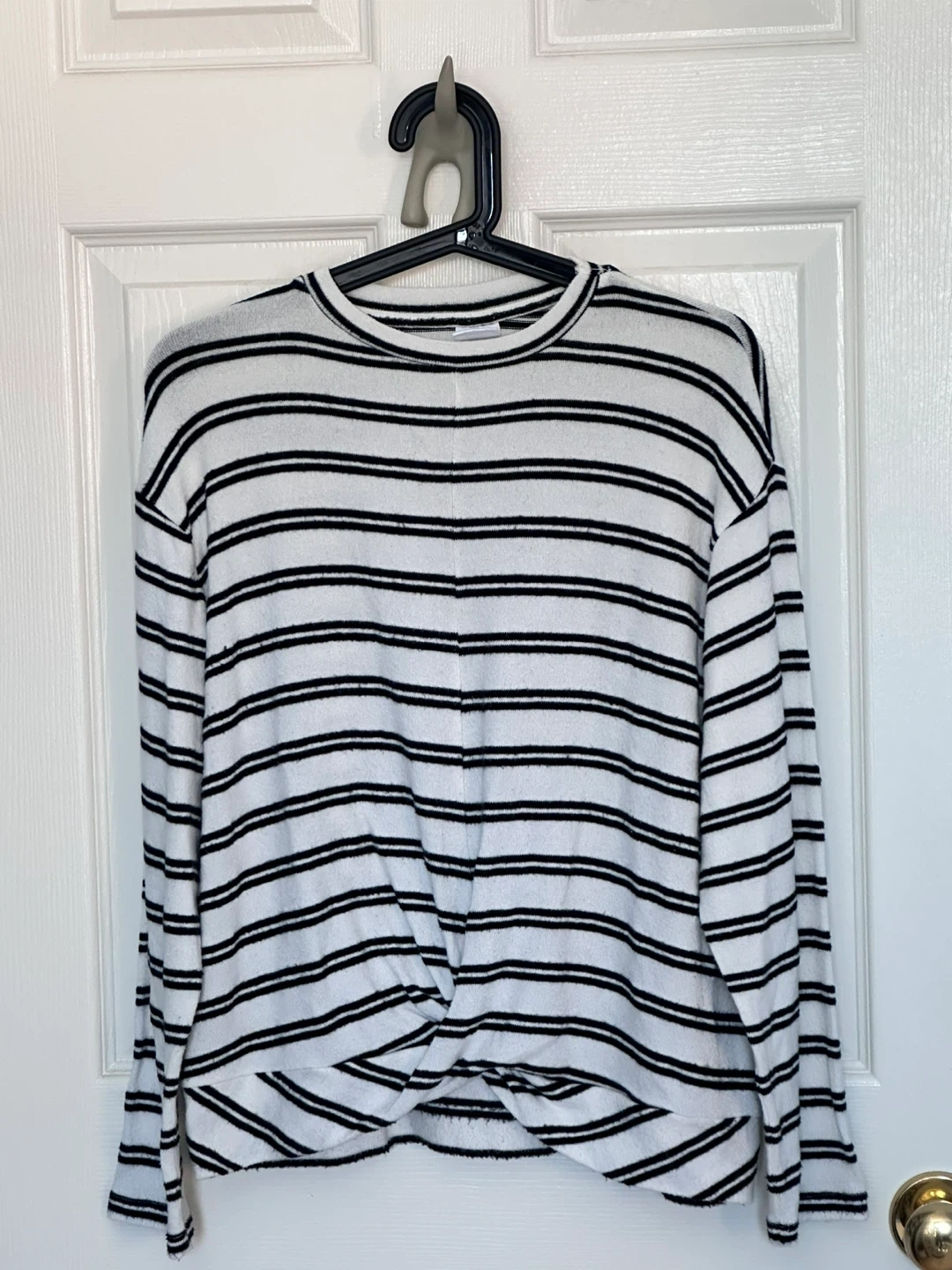 A comfy long sleeve top featuring a classic black and white stripe pattern. It has a flattering twist detail at the hem. This top's knit material makes it a cozy choice for casual wear.