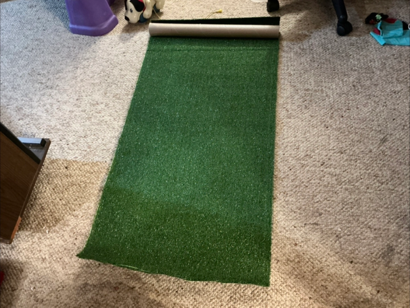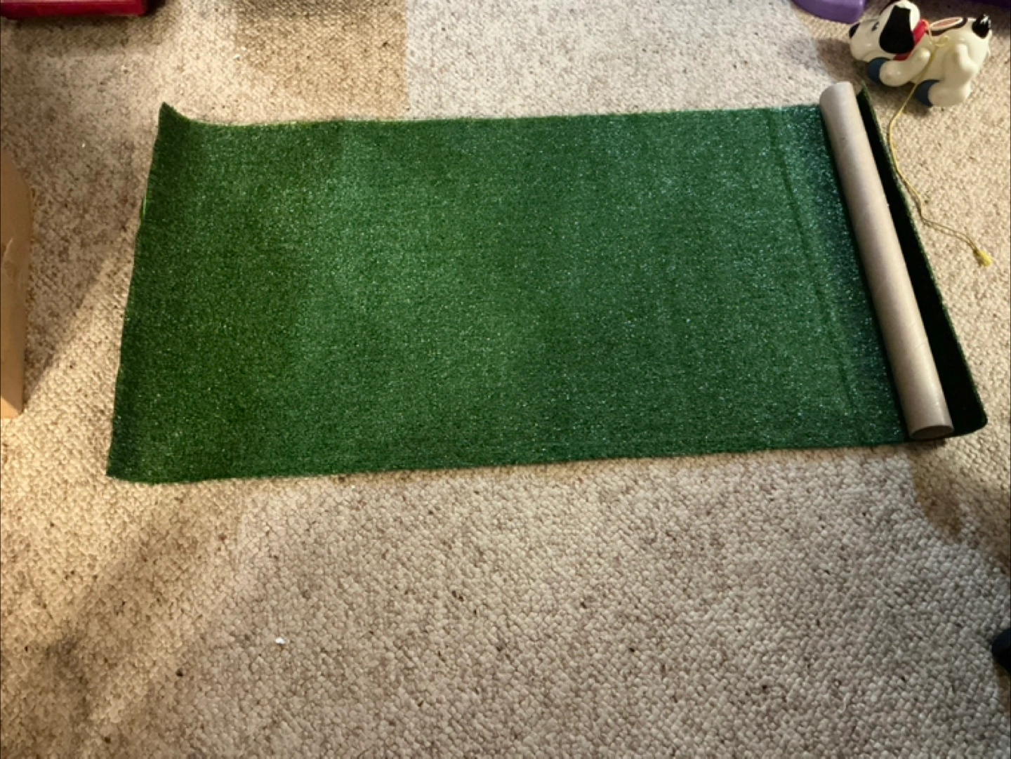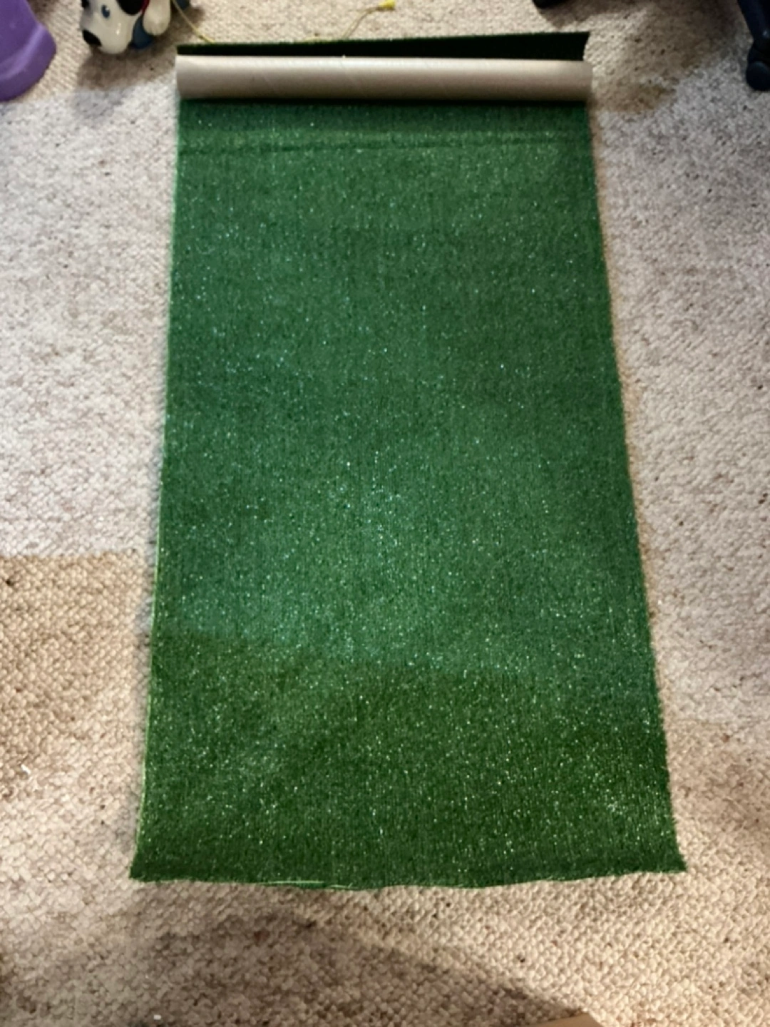 Green artificial turf 24” x 48”. Rolled up. Refill for dogs pee pad. Also great for crafts or other projects.