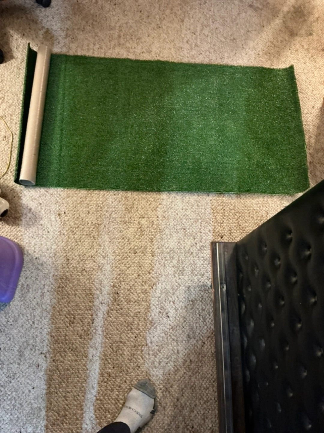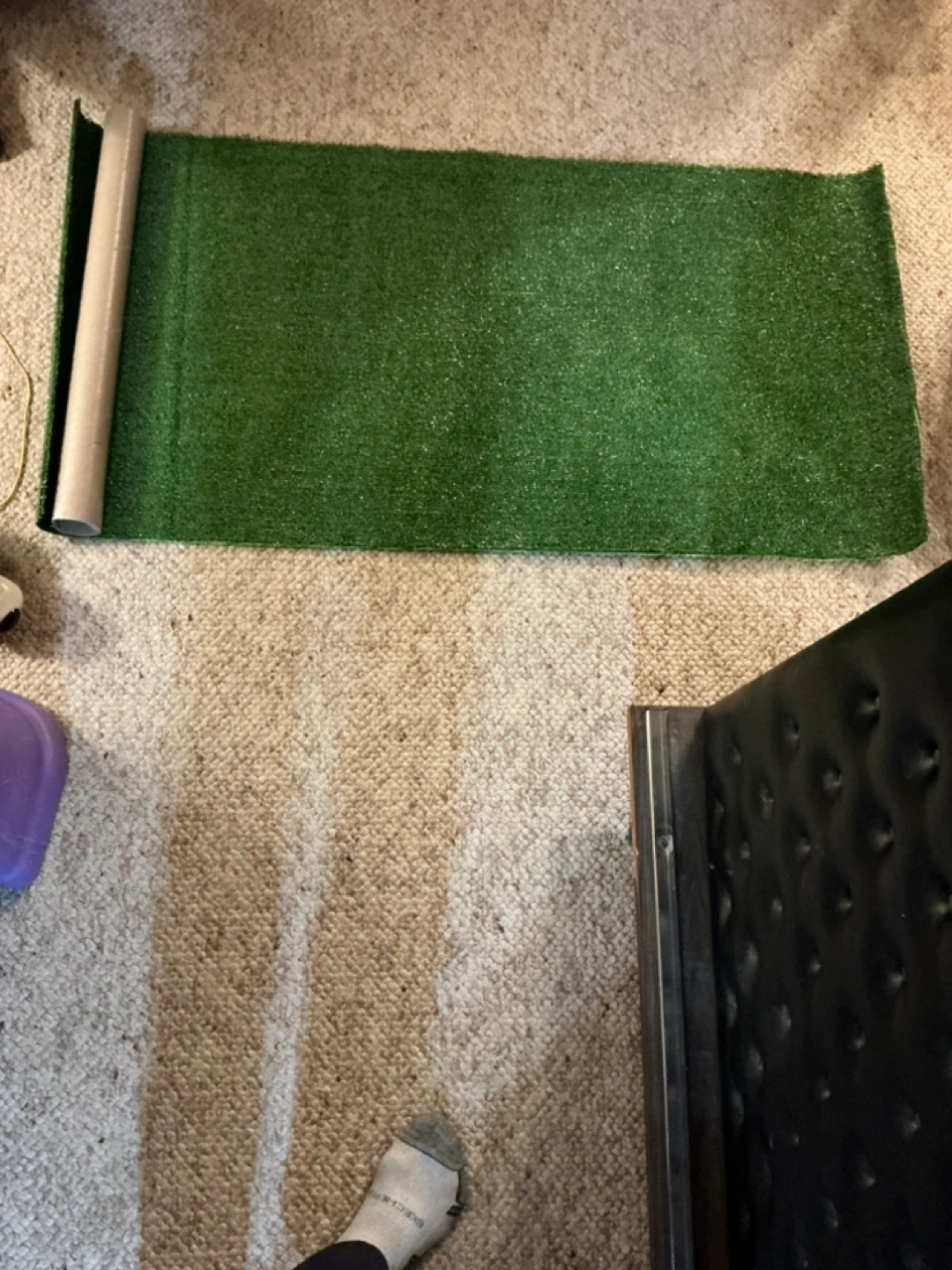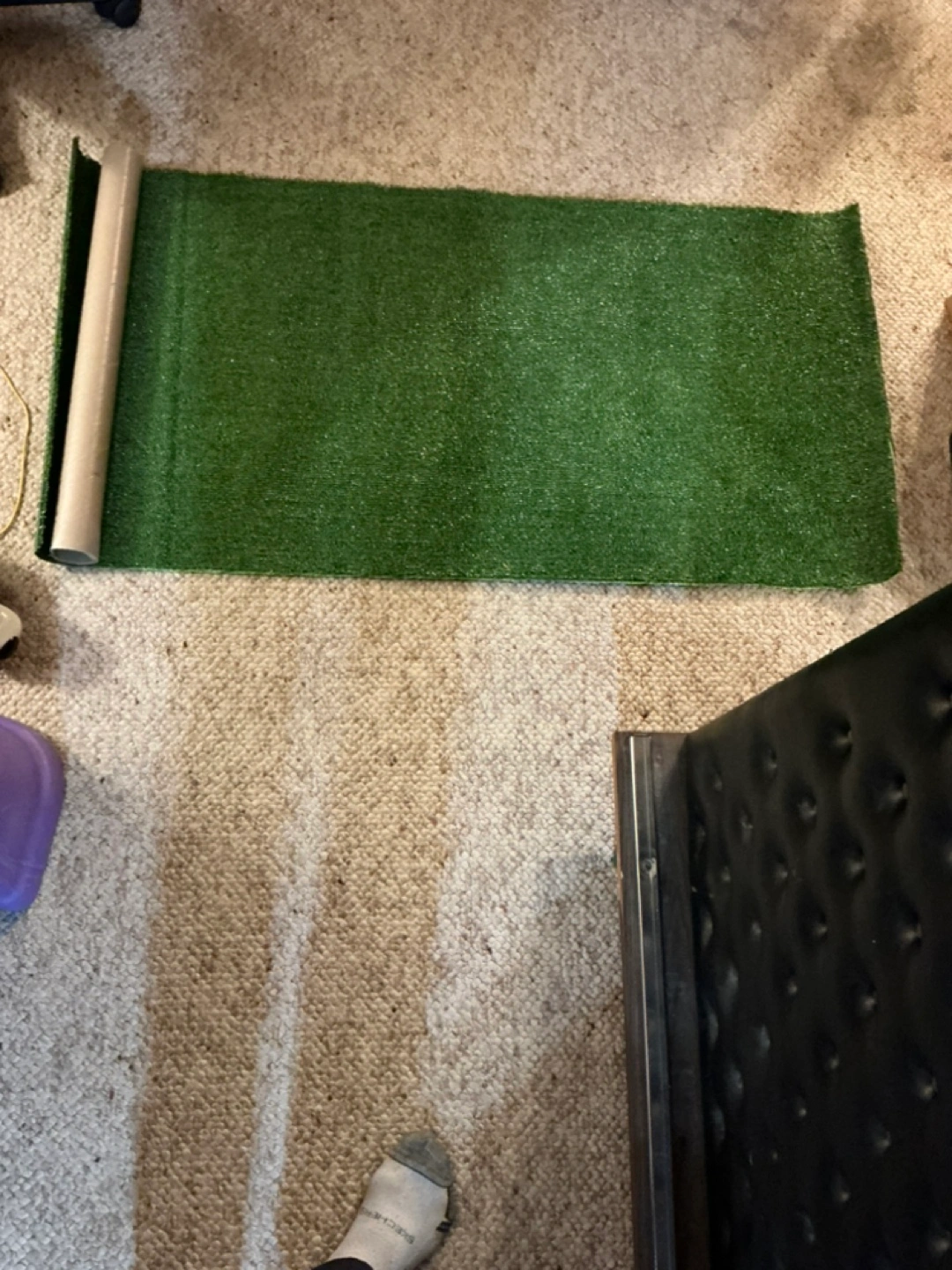 Green artificial turf 24” x 48”. Rolled up. Refill for dogs pee pad. Also great for crafts or other projects.