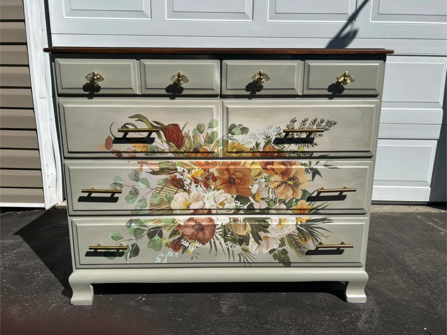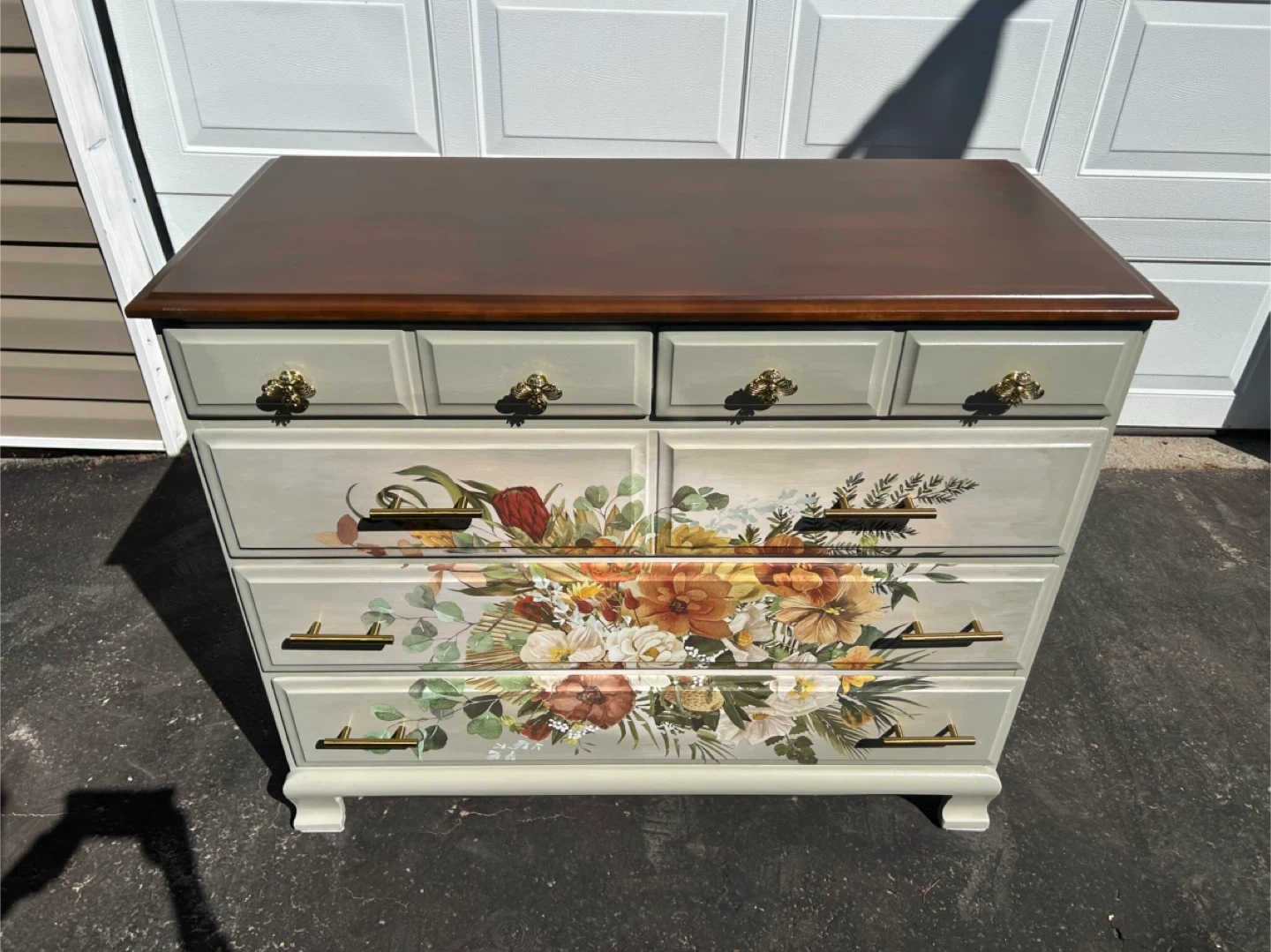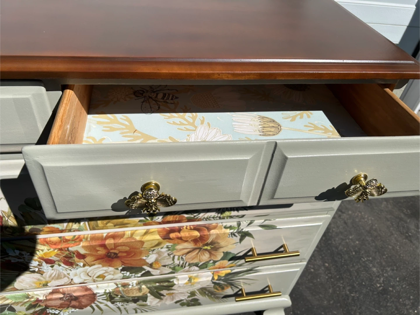 Selling a beautifully refinished dresser! It features a unique floral design and decorative bee-shaped knobs. The top is a lovely dark wood, while the rest of the dresser is painted in a soft grey-green colour. The drawers also have a cedar bottom with one drawer being completely cedar. Measurements: 34 1/2” H X 42” W x 18” D Drawers interiors: 38” x 17” (3) 18” x 17” (2)