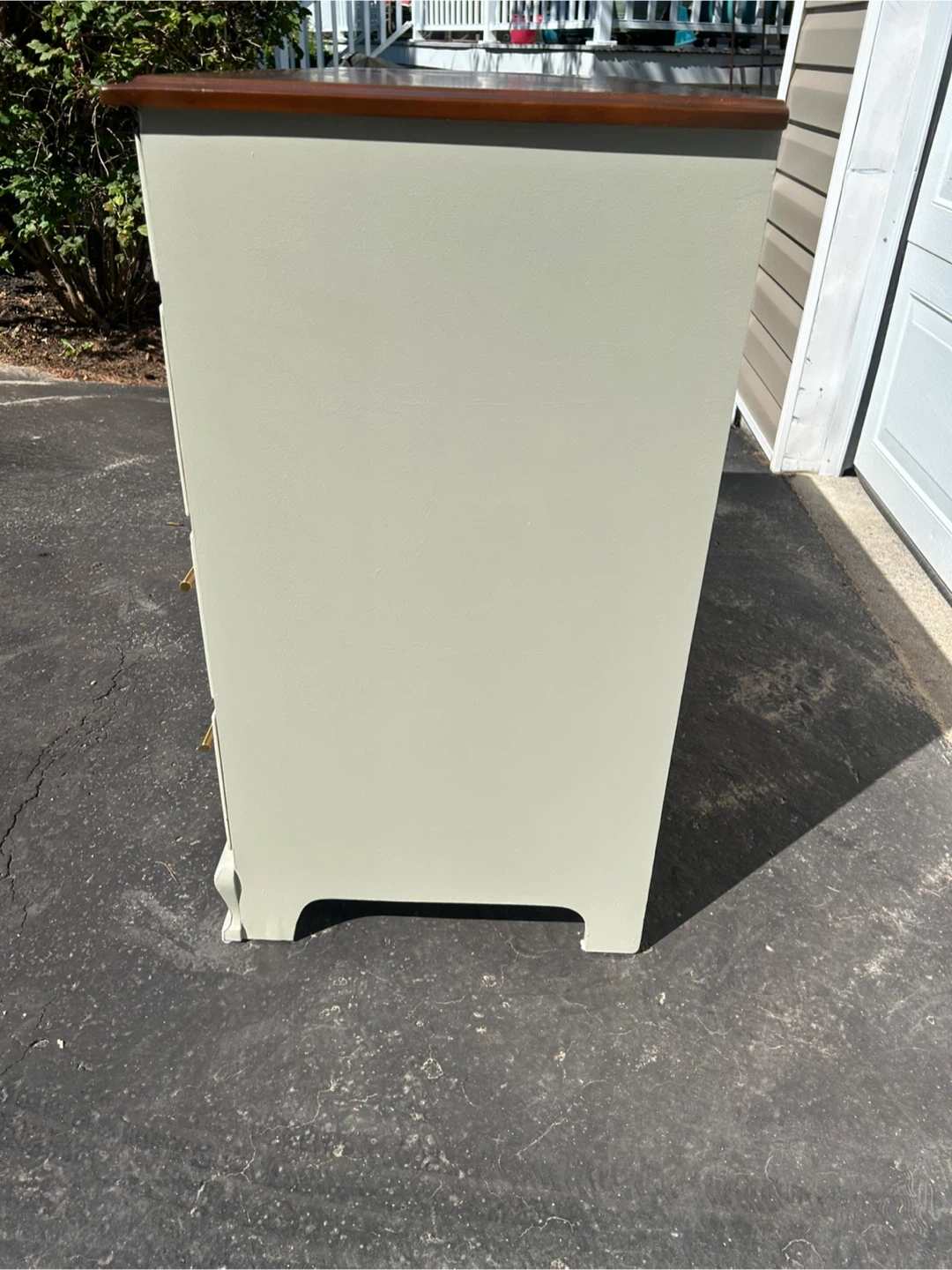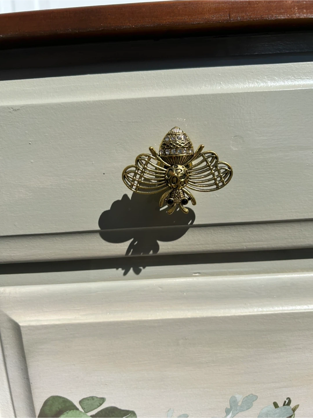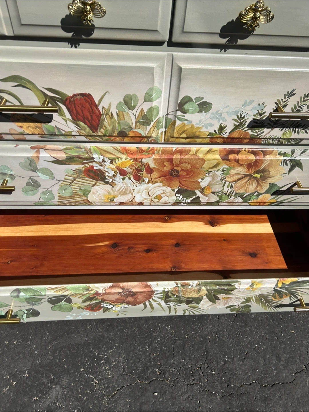Selling a beautifully refinished dresser! It features a unique floral design and decorative bee-shaped knobs. The top is a lovely dark wood, while the rest of the dresser is painted in a soft grey-green colour. The drawers also have a cedar bottom with one drawer being completely cedar. Measurements: 34 1/2” H X 42” W x 18” D Drawers interiors: 38” x 17” (3) 18” x 17” (2)