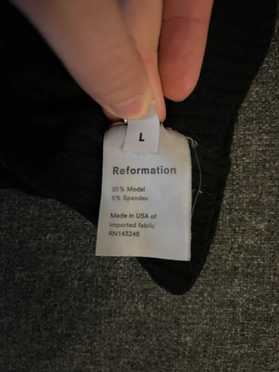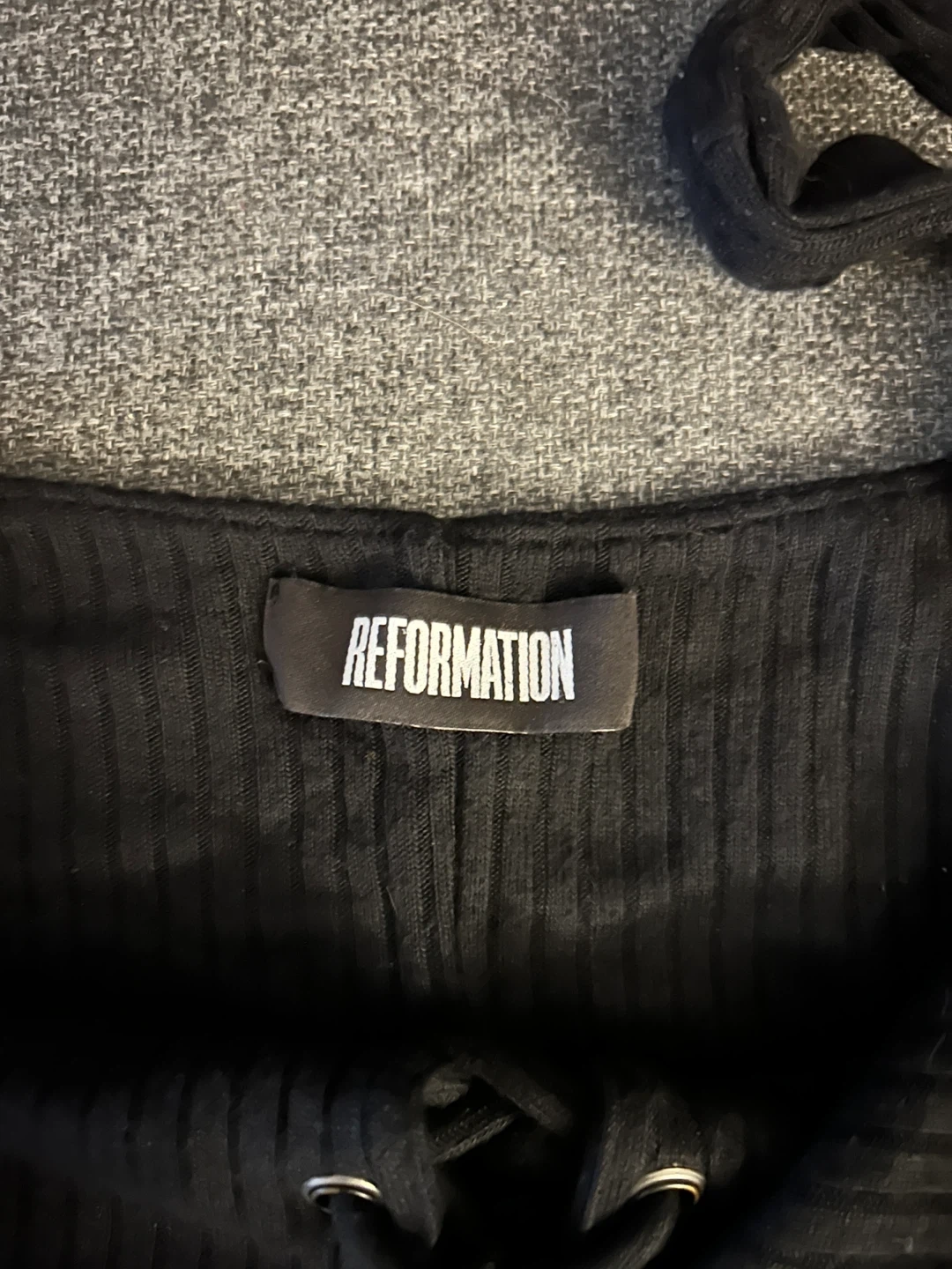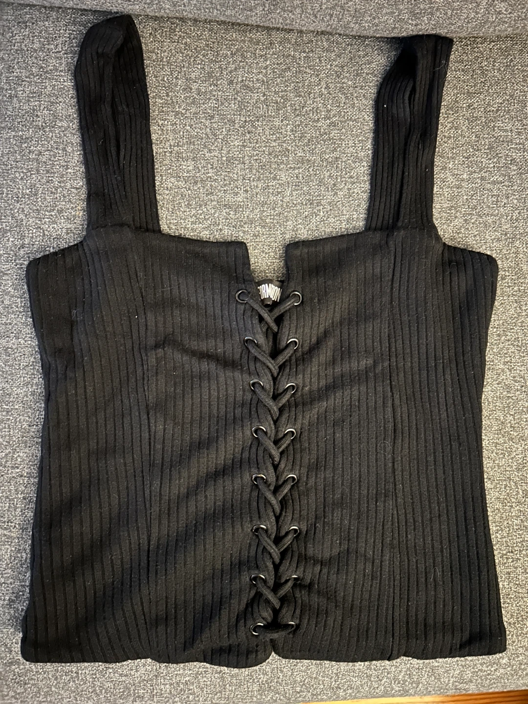 Selling a black ribbed tank top from Reformation! It's a size large and made of 95% modal and 5% spandex. With lace-up detail in the front. Perfect for layering or wearing on its own.