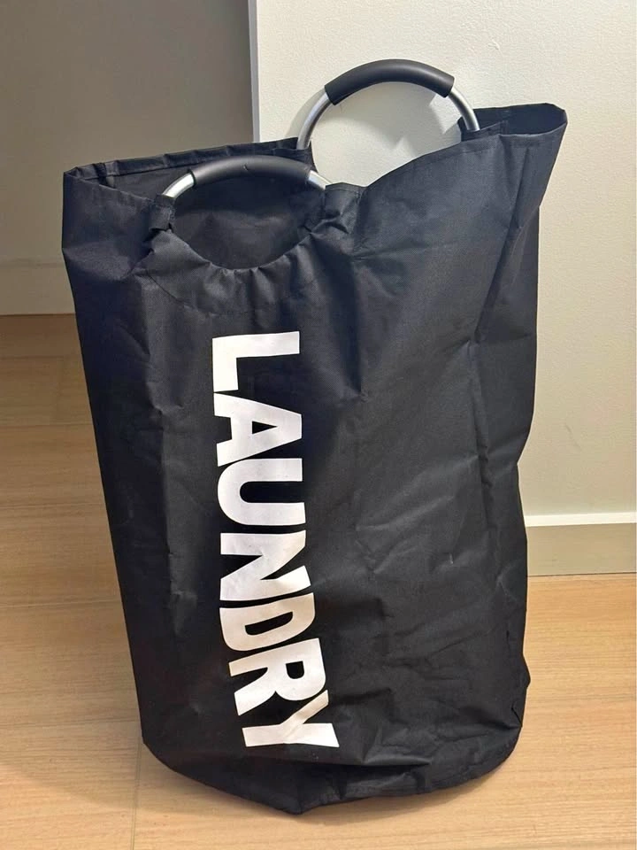 Spacious laundry basket. Black fabric with "LAUNDRY" text on side. Has two sturdy handles for easy carrying. Good for clothes or storage. Pickup at my apartment lobby only. Laundry hamper bag - $5 (bought for $14 on Amazon)