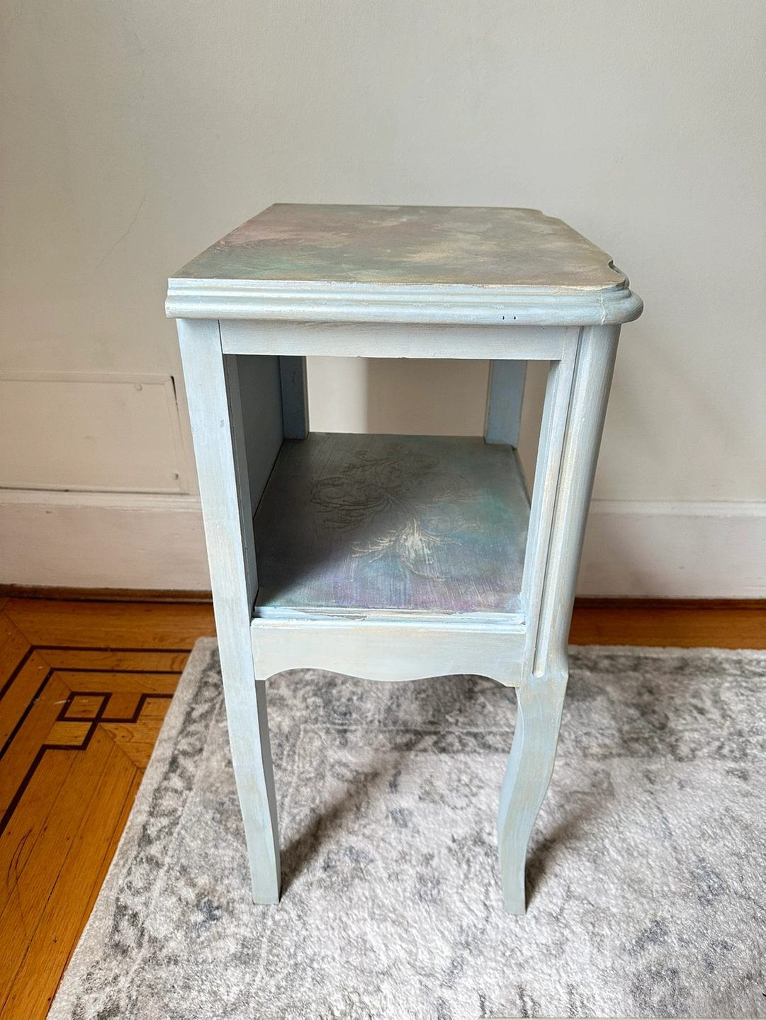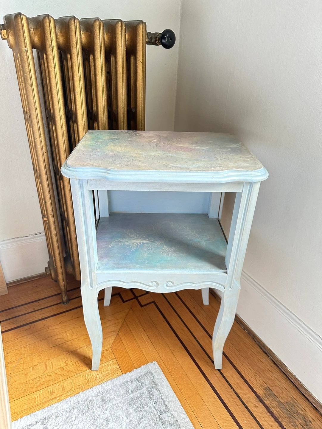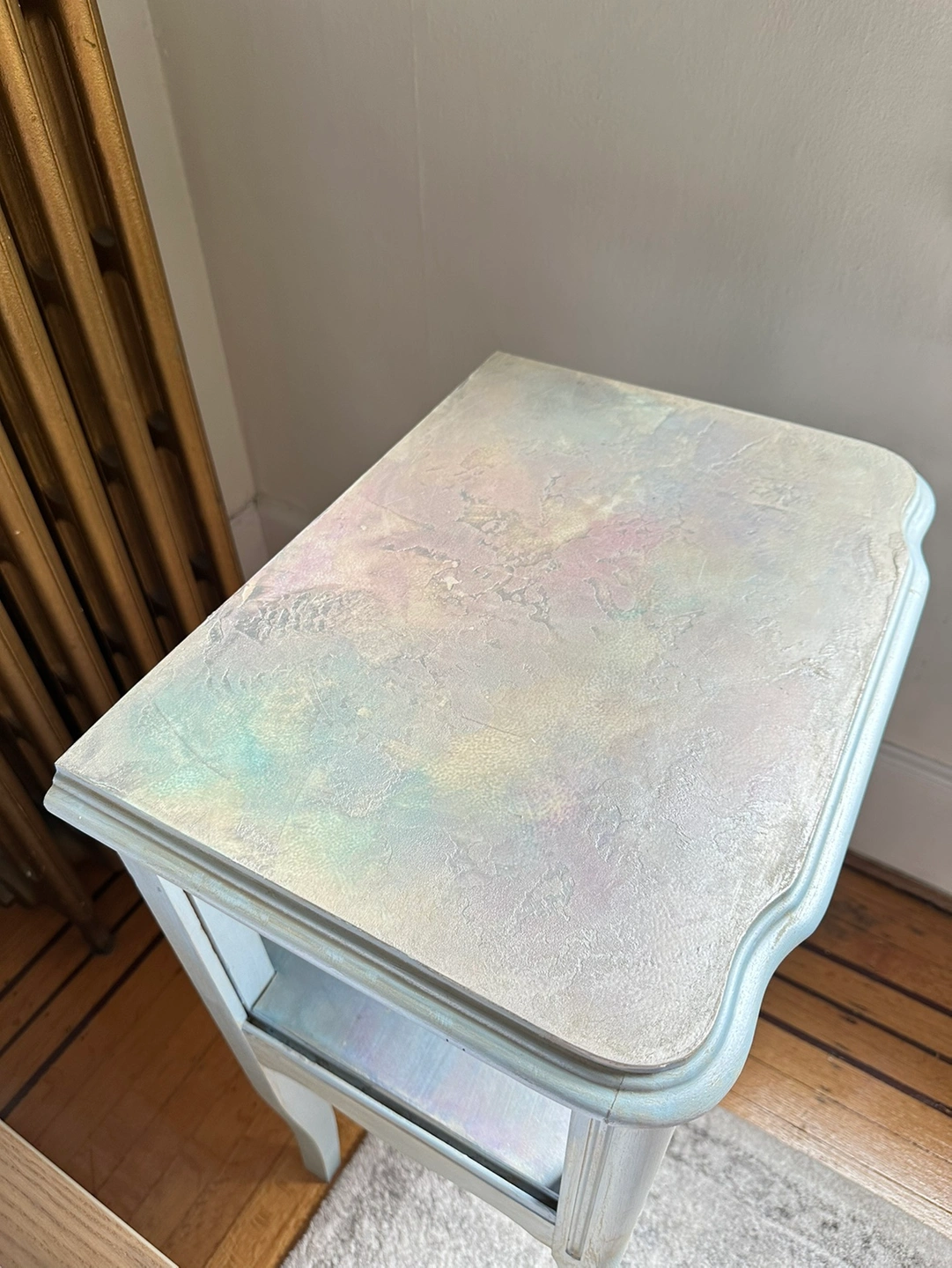 127Beautiful soft pastel blue colour with delicate pearl-like sheer marble of other pastels (pink, purple, gold, silver) on this re-painted vintage small table. Perfect for hallway, bedside table, or any small corner No damage Measurements: - tabletop: 18” x 13” - frame: 16 ⅜“ x 26 ⅝“ x 12” From a pet-free smoke-free home