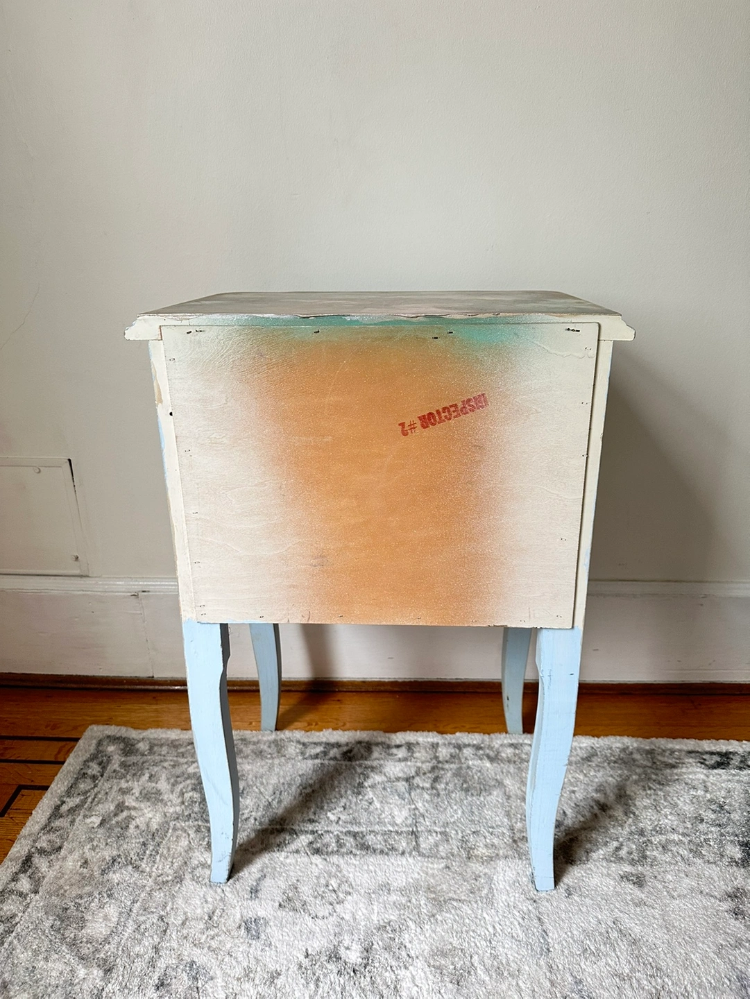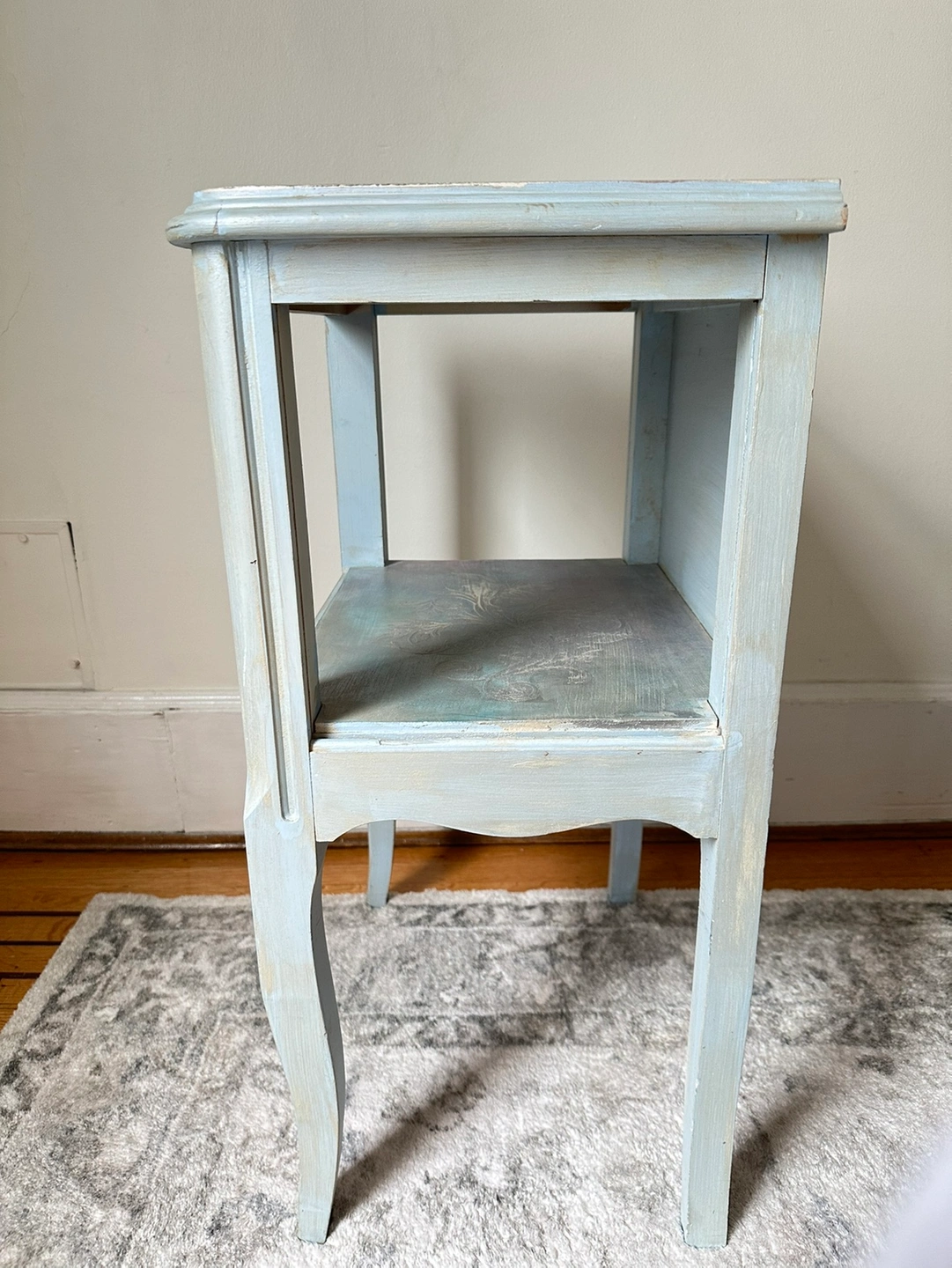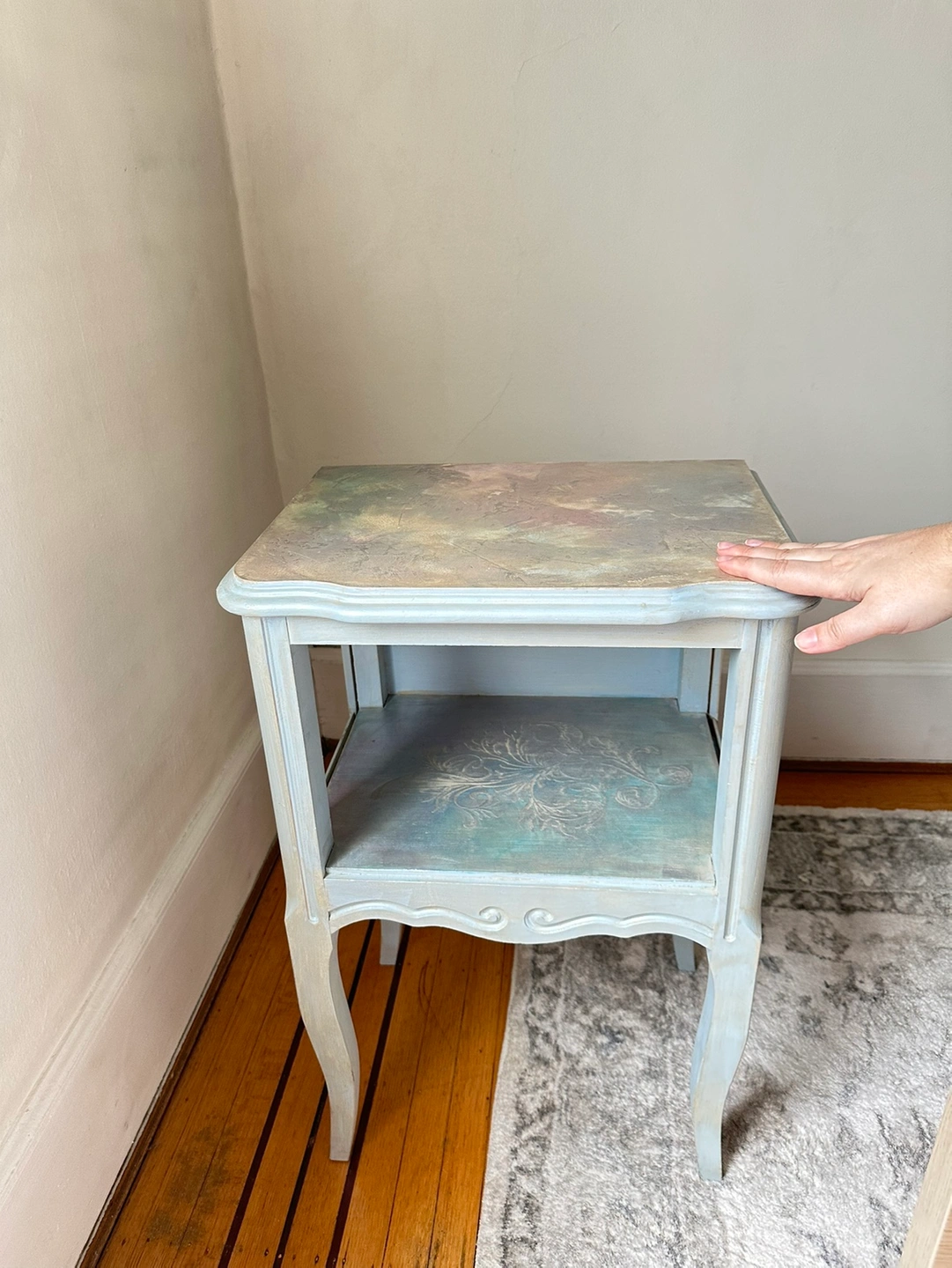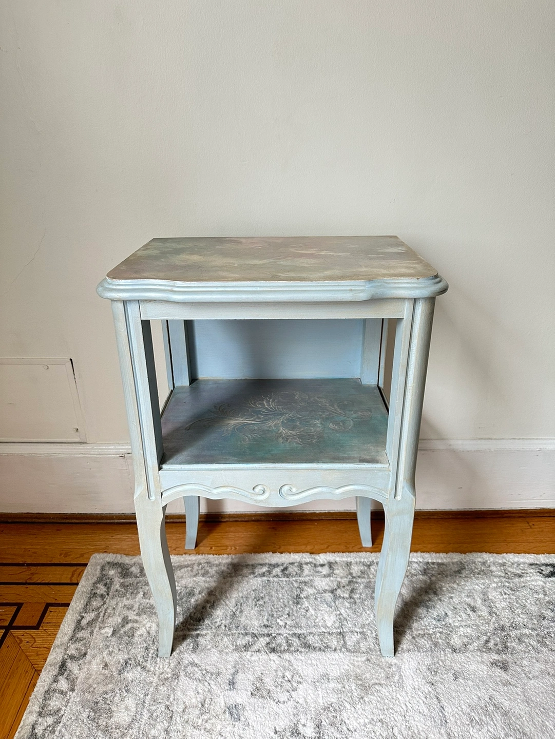 127Beautiful soft pastel blue colour with delicate pearl-like sheer marble of other pastels (pink, purple, gold, silver) on this re-painted vintage small table. Perfect for hallway, bedside table, or any small corner No damage Measurements: - tabletop: 18” x 13” - frame: 16 ⅜“ x 26 ⅝“ x 12” From a pet-free smoke-free home