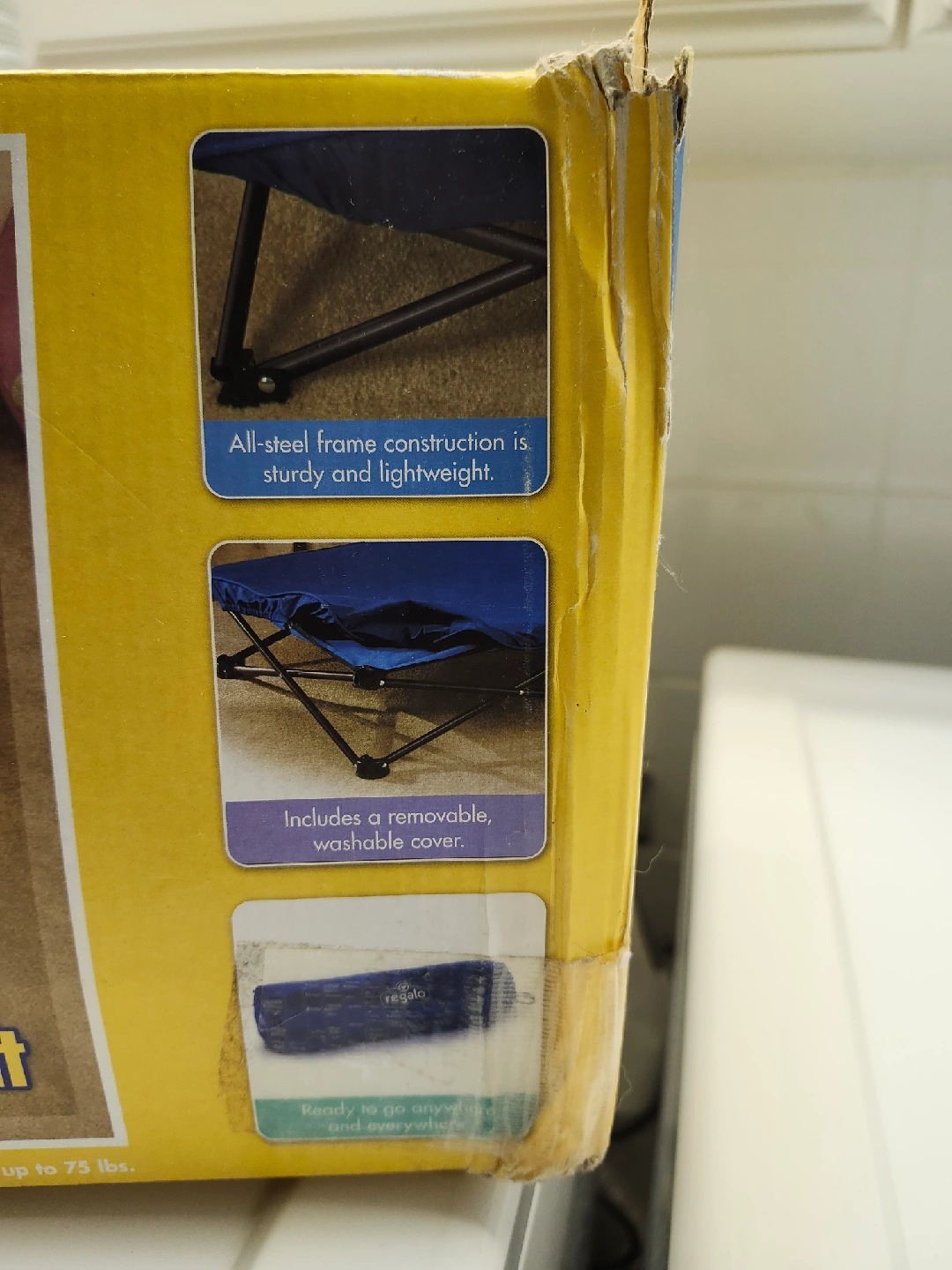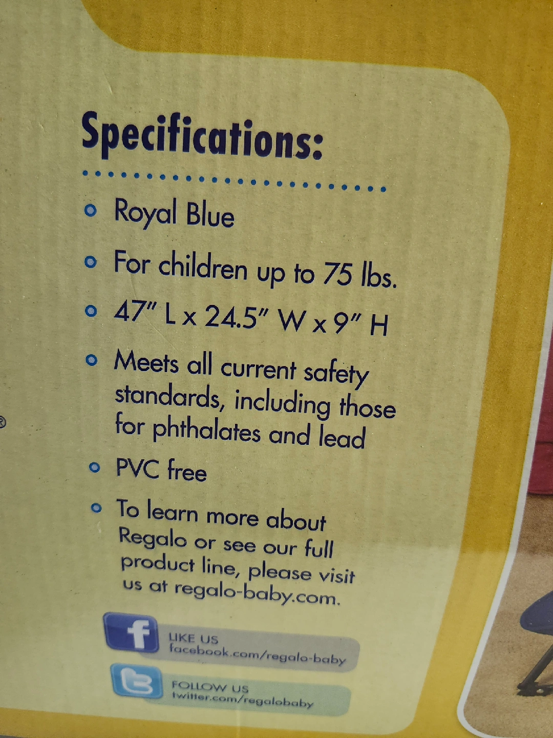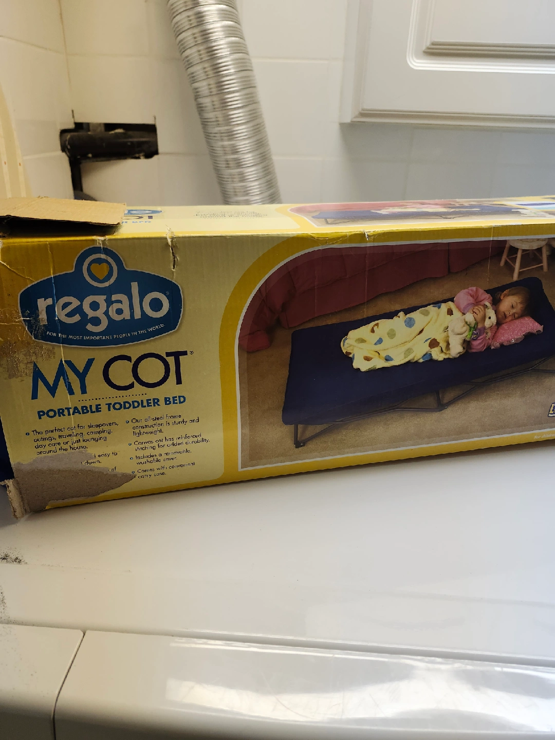 10Selling a Regalo My Cot portable toddler bed. It's in great condition and comes in the original box. The cot is royal blue and suitable for children up to 75 lbs. It measures 47" L x 24.5" W x 9" H. The all-steel frame construction is sturdy and lightweight. Includes a removable, washable cover, making it easy to keep clean