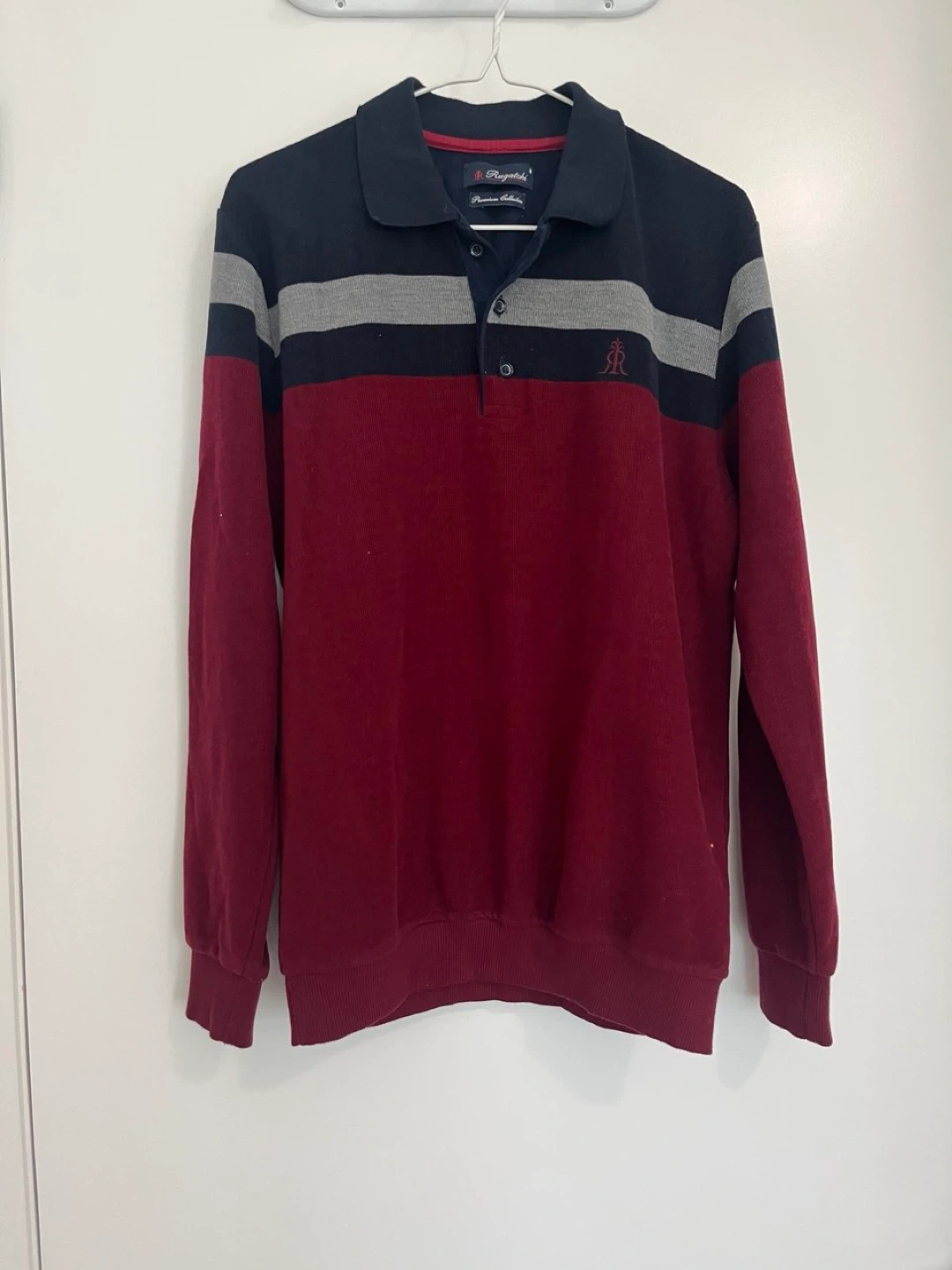 10Selling a Regatchi polo-style sweatshirt featuring a burgundy body, navy collar and shoulders, and grey stripe. It's in great shape and ready for a new home!