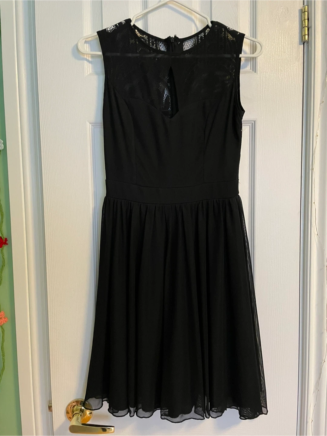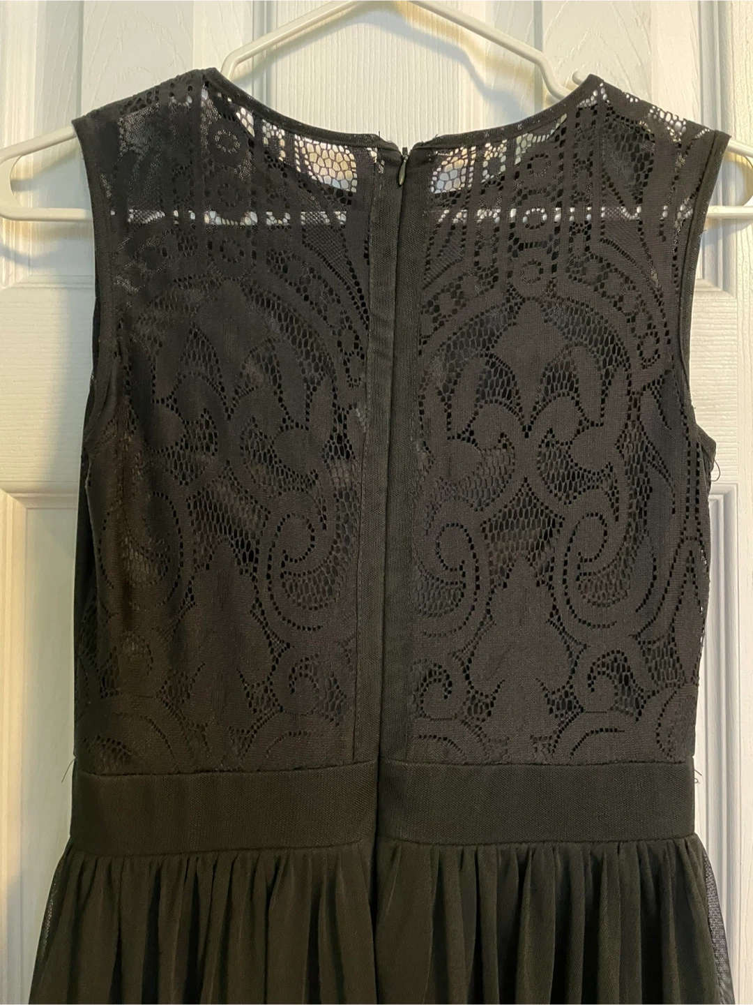 Double-layered black dress with lace backed bodice. Zips in the back. Sleeveless. Skirt ends above knee.